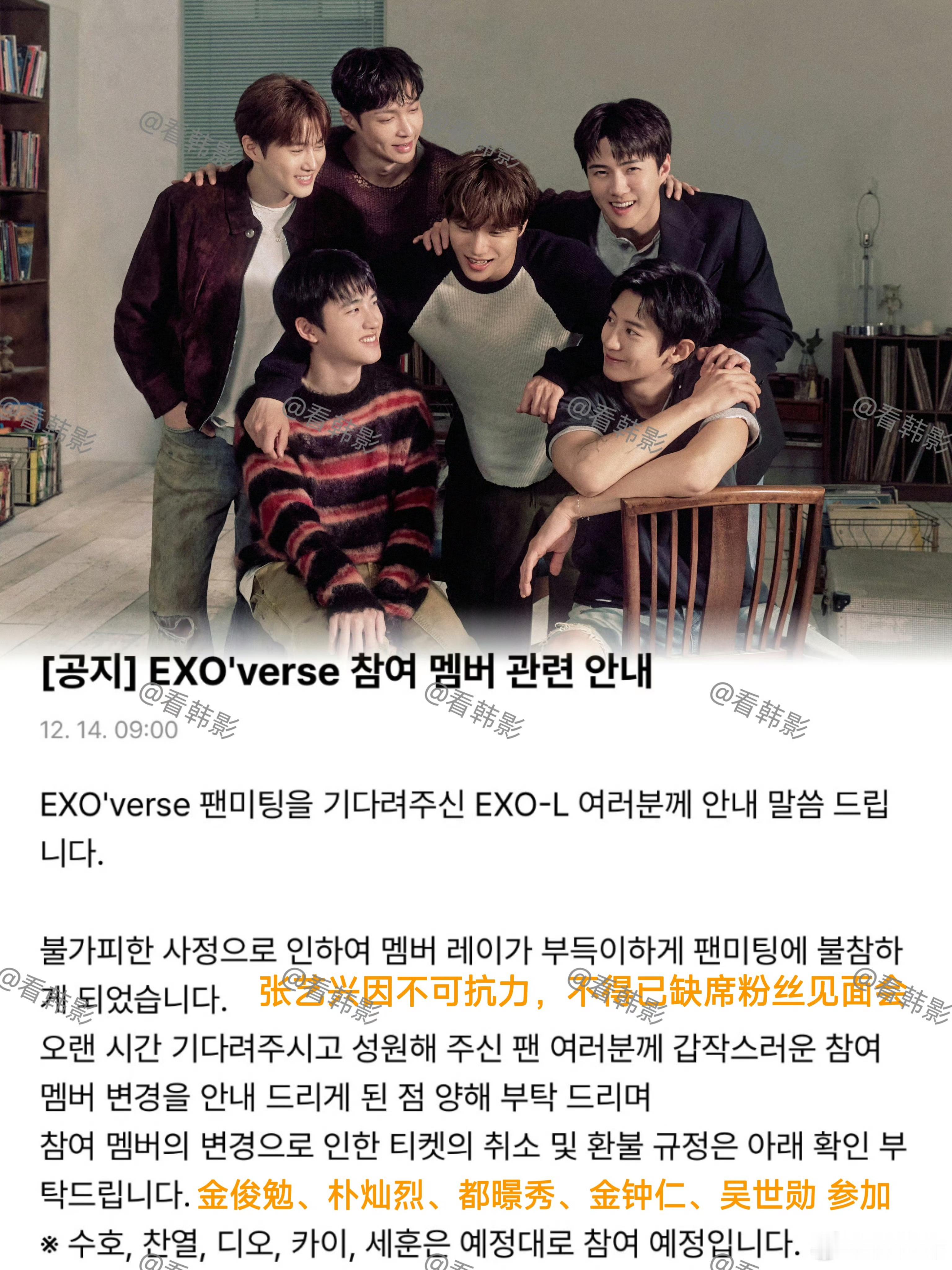 张艺兴 好突然!由于不可避免的原因,张艺兴将不参加EXO的粉丝见面会。期待与张艺兴更好的见面 张艺兴不参加EXO见面会
