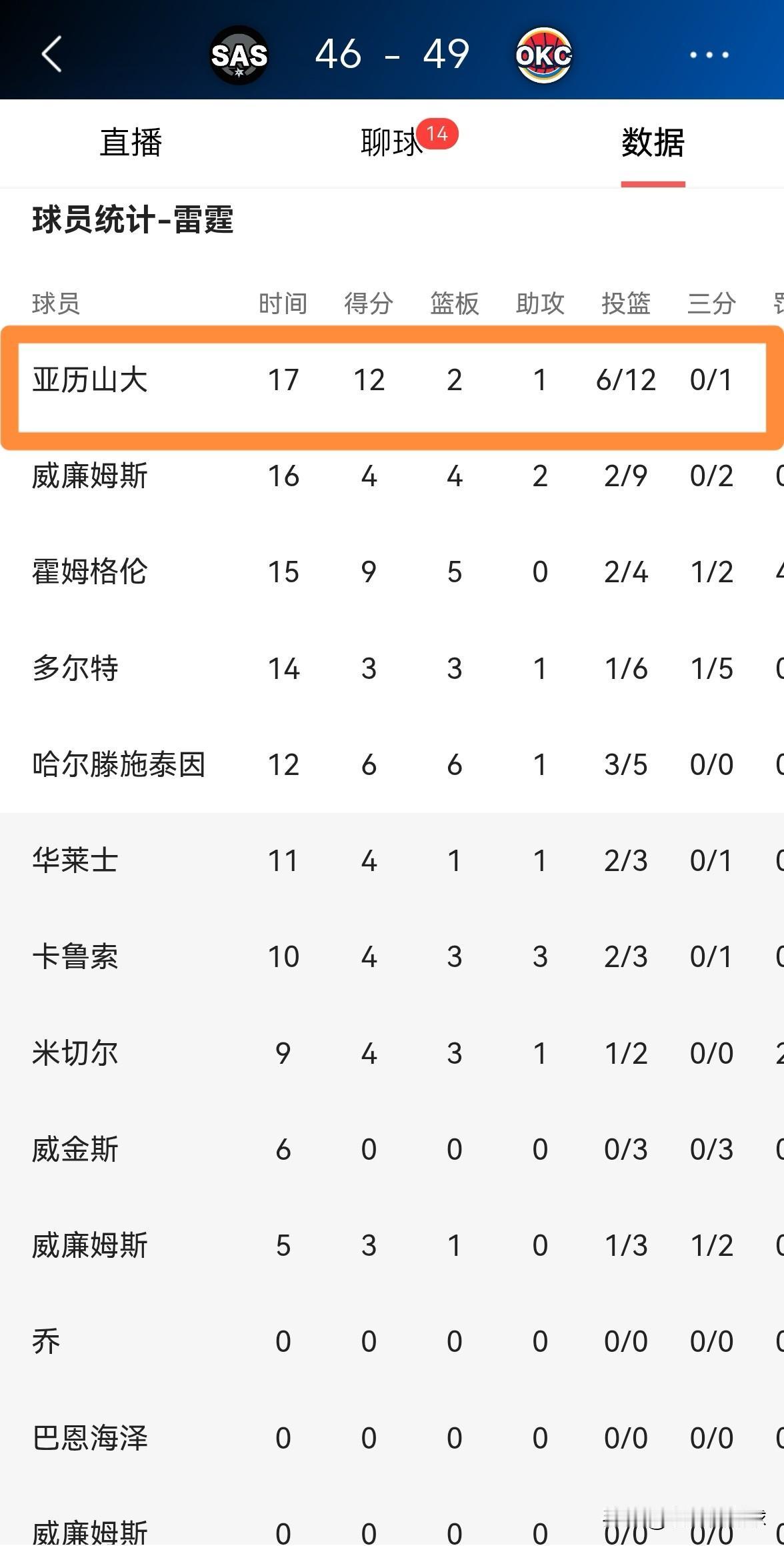 雷霆超级巨星亚历山大真是太不受联盟待见了!在今天进行的雷霆和马刺的上半场比赛中,发生了特别让人吃惊的一幕,那就是亚历山大没有得到一次罚球。 在前两节比赛中,亚历山大首发出战17分钟,投篮12中6得到12分,没有获得任何的罚球,他的场上正负值为+4,带领球队以49:46领先马刺结束了前两节的比赛。 作为当今联盟排名前三的超级巨星,亚历山大竟然在17分钟的上场时间里没有获得任何的罚球,难道亚历山大已经失宠了吗?