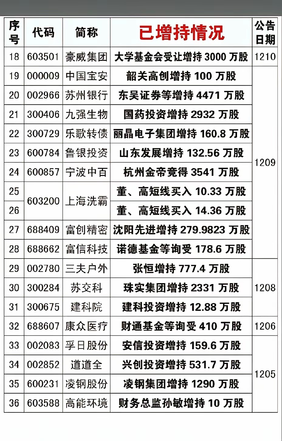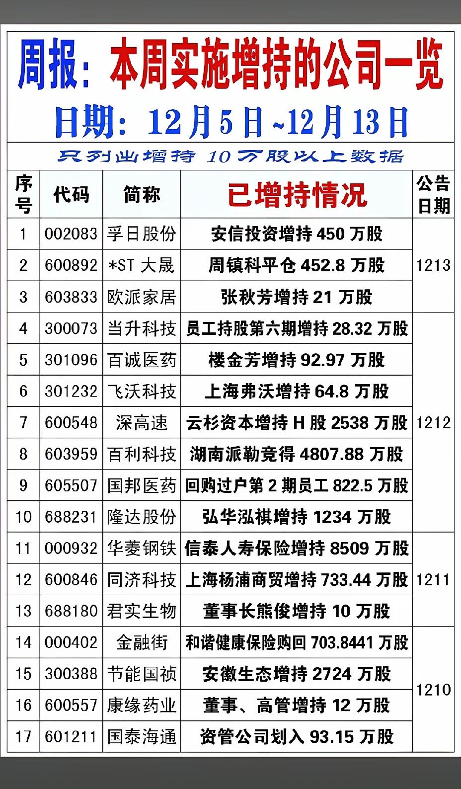 12月14日,下周A股这些股票有望大涨!!!本周共有36家公司实施增持计划,重点关注:东吴证券等增持苏州银行4471万股,后市值得高看;杭州金带竞得宁波中百3541万股,后市值得期待;湖南派勒竞得百利科技4807.88万股,后市值得重点关注!!!股市分析