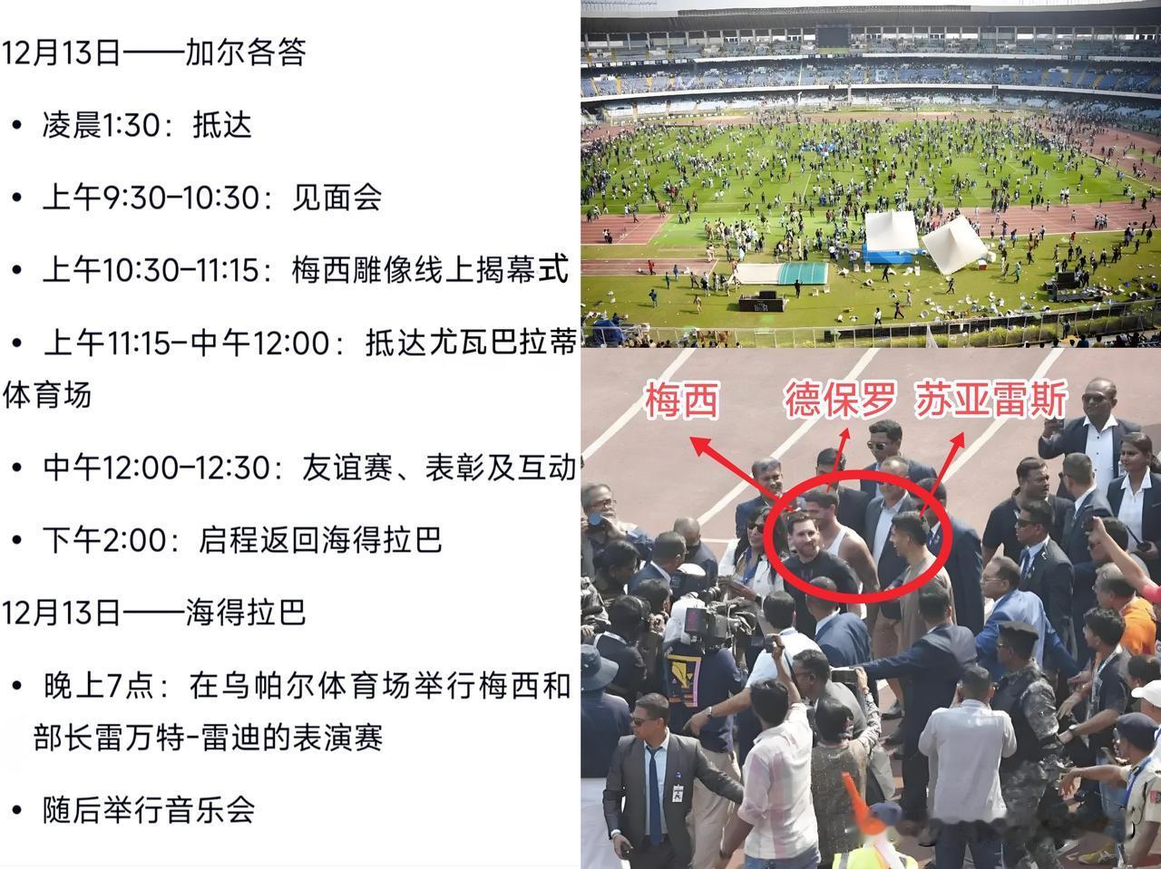 340元,远看梅西10分钟。 官员是黄牛,活动变闹剧。 就像一部印度电影,很魔幻! 昨日,"球王"梅西携"老铁"苏亚雷斯、"保镖"德保罗乘坐私人飞机抵达南亚大陆,马不停蹄的开启3天4站的"GOAT印度之旅",这是梅西职业生涯首次到访印度。 第1站加尔各答,在可容纳8.5万人的尤瓦巴拉蒂体育场,梅西等三人绕场一周并向球迷致意。因现场管理混乱无序,取消了友谊赛、表彰及互动,活动仅持续10分钟便草草收场,之后三人赶往第2站海得拉巴,参加在乌帕尔体育场举行的表演赛和在法鲁克纳玛宫举办的音乐见面会。 据悉,加尔各答活动最低票价为4366卢比(约341元),海得拉巴活动最低票价为2250卢比(约176元),可与梅西近距离接触15分钟的音乐会票价为100万卢比(约7.82万元)。 继加尔各答和海得拉巴两站之后,三人还将访问孟买和新德里两座大城市。