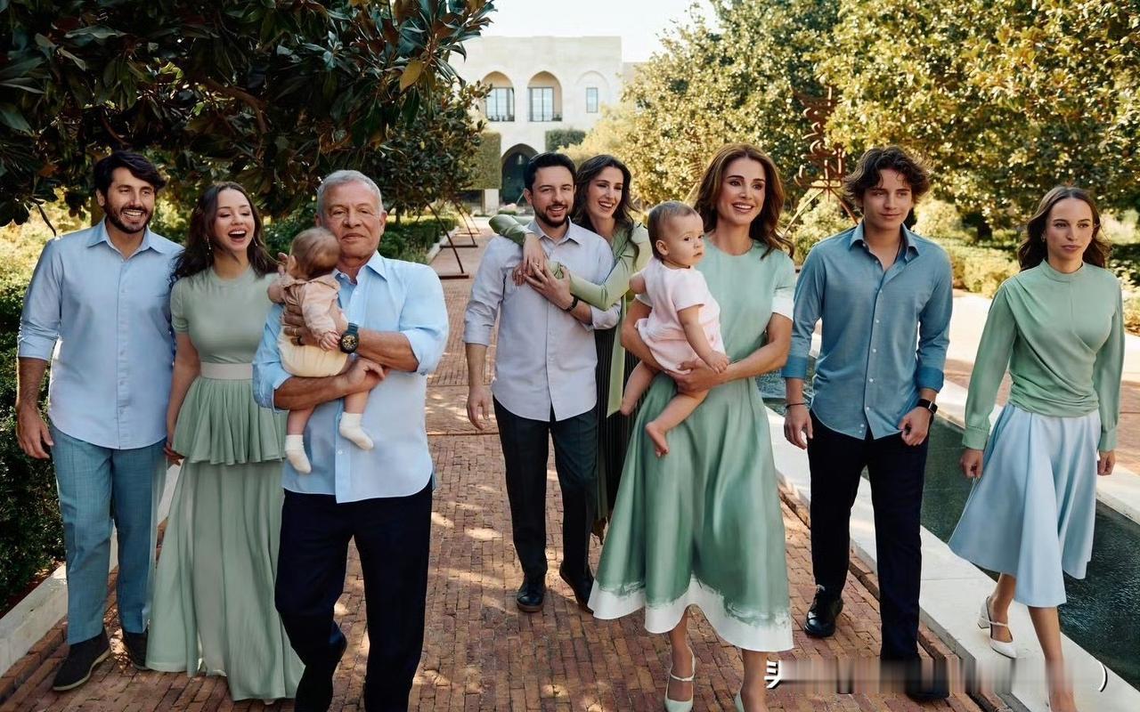 约旦一家的圣诞贺卡来啦!一大家子人都商量好了,连衣服都搭配了同色系,国王抱着外孙女,王后抱着孙女,这一大家子人很和谐!