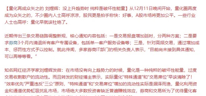 是时候整限制量化,让交易更公平!限制量化的呼声越来越高,因为当前的矛盾太为突出,量化利用资金,算法,特殊通道,交易席位的优势,越来越成为市场交易绝对主导,量化疯狂扩容,其它资金举步维艰。资金,算法,特殊通道,交易席位的综合优势对其它投资者,可以说是降维打击,根本没有还手之力。很显然,降低印花税,各种税费,最大的受益者是量化,毕竟普通投资者一天做一笔交易就是高频,而量化每秒299笔,一天几万笔。T+1,涨停板跌停板,本来是抑制市场波动,保护散户,现在,量化平铺变相T+0,利用资金优势拉涨停,砸跌停。日内高频,收割波动,流动性,成了量化最大的收益来源。让交易更公平,让机构做耐心资本,可以学学印度,散户T+0,机构至少T+1,T+2,T+3,而不是现在散户T+1,量化T+0。简单来说,提高机构的交易成本,让机构做长线,耐心资本,市场稳定器,这样机构才会去积极做多,价值投资,而不是天天盯着散户的口袋。如果不改进,量化越来越疯狂扩容,市场就只剩下机器人了.....智能机器人