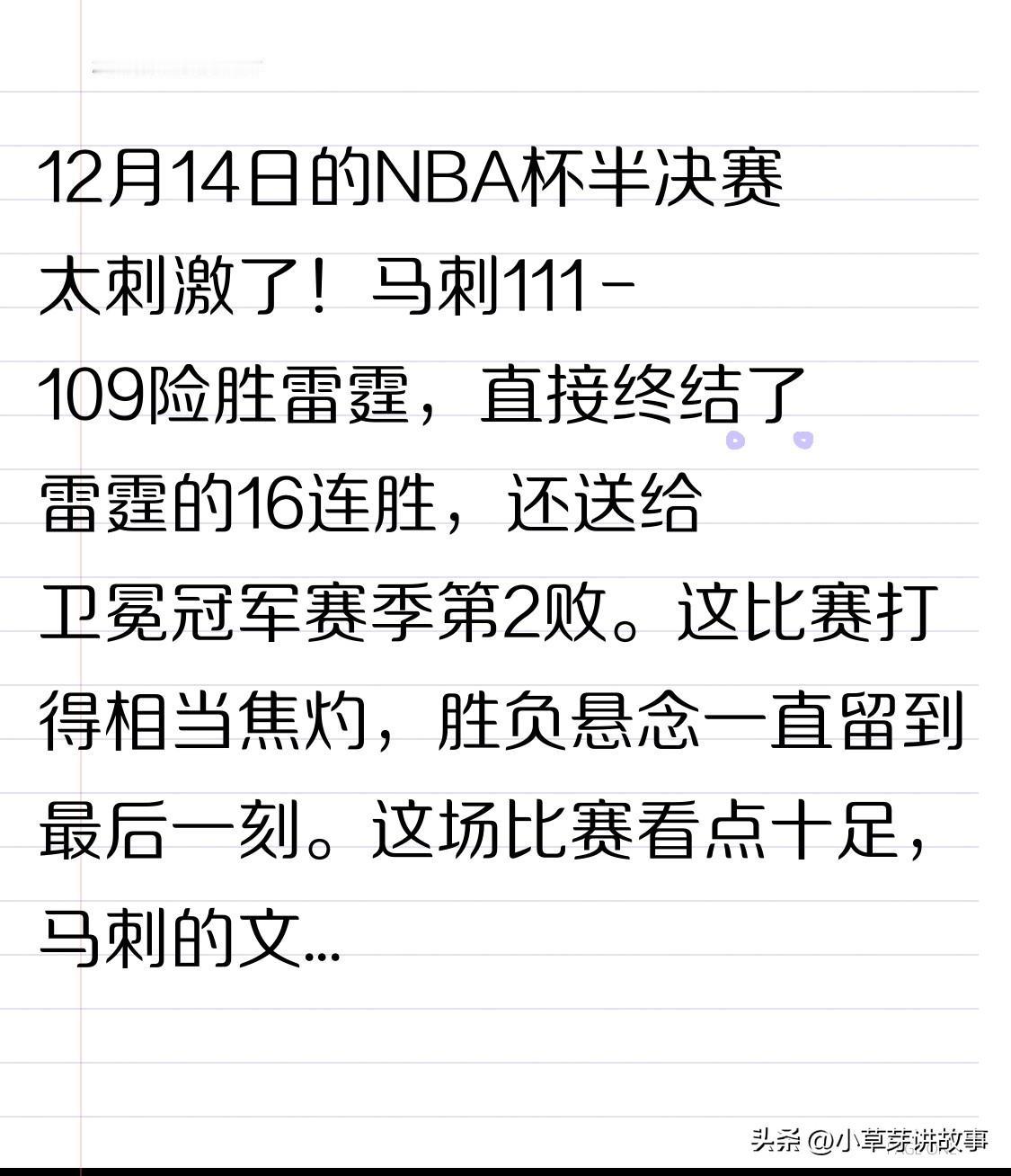 震惊!12月14日NBA杯半决赛精彩至极!马刺以111 - 109险胜雷霆,终结其16连胜,让卫冕冠军尝到赛季第2败。比赛异常焦灼,胜负悬念保留到最后。 此役看点十足,马刺文班亚马、雷霆哈腾复出,文班生涯首次替补,雷霆本赛季首次全员健康出战。文班拿下22分9板2帽,瓦塞尔等表现出色;亚历山大贡献29分,霍姆格伦等发挥不错。马刺获胜意义重大,将与尼克斯会师决赛,值得期待!