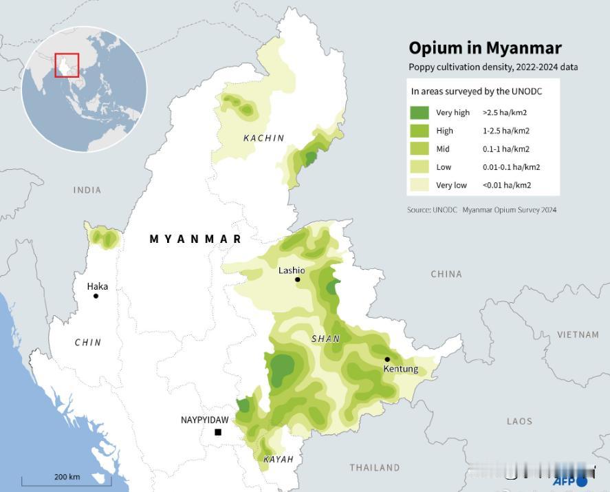 缅甸掸邦继续铲除罂粟115亩! 缅甸正与联合国、邻国、东盟成员国、湄公河区域国家、BIMSTEC成员国,以及国际毒品管制机构合作,进一步加强禁毒工作进程。缅甸掸邦区域的罂粟种植面积,目前没有具体统计,但是根据之前的记录,不低于万亩的水平,这个是得到各方的公认的。 因为掸邦区域面积太大了,整个掸邦的高原,占了总面积的七成,这些高原和高山和密林当中,到处都是罂粟田。而且罂粟这种作物,还不挑地,只要是有土的地方,就能长罂粟,非常高产,所以缅甸想要铲除罂粟种植,真的非常困难。 当然再困难也要行动,能毁掉一点是一点。当前的国际局势下,缅甸也要向正常国家转进,不能走以前那种老路了,要走正规路线贸易路线,而不是围绕这些罂粟和网络公司的这些歪道,是都不长久的,要走就走正道。 大家也可以明白,不管怎么说,现在的缅甸,绝对是需要改变的,希望铲除这些罂粟田之后,继续努力继续铲除,要不然后续局面,还有更多的恶化。 在图三配图当中,博主展示出来了掸邦区域的罂粟种植区域。绿色区域就是罂粟区,真的是非常的面积广大,不铲除是真的很危险,还是得各方共同努力。 但愿能有更多进步!