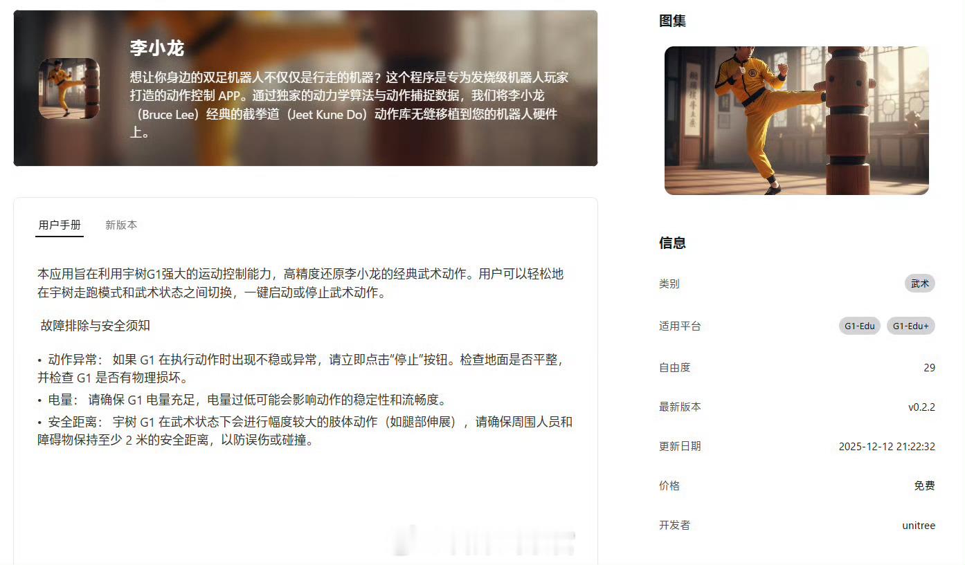 宇树机器人发布人形机器人“App Store”,用户可下载复杂动作预设,如李小龙截拳道动作库。未来将建立庞大数据库,让普通用户也能轻松体验。宇树科技308_IO人形机器人