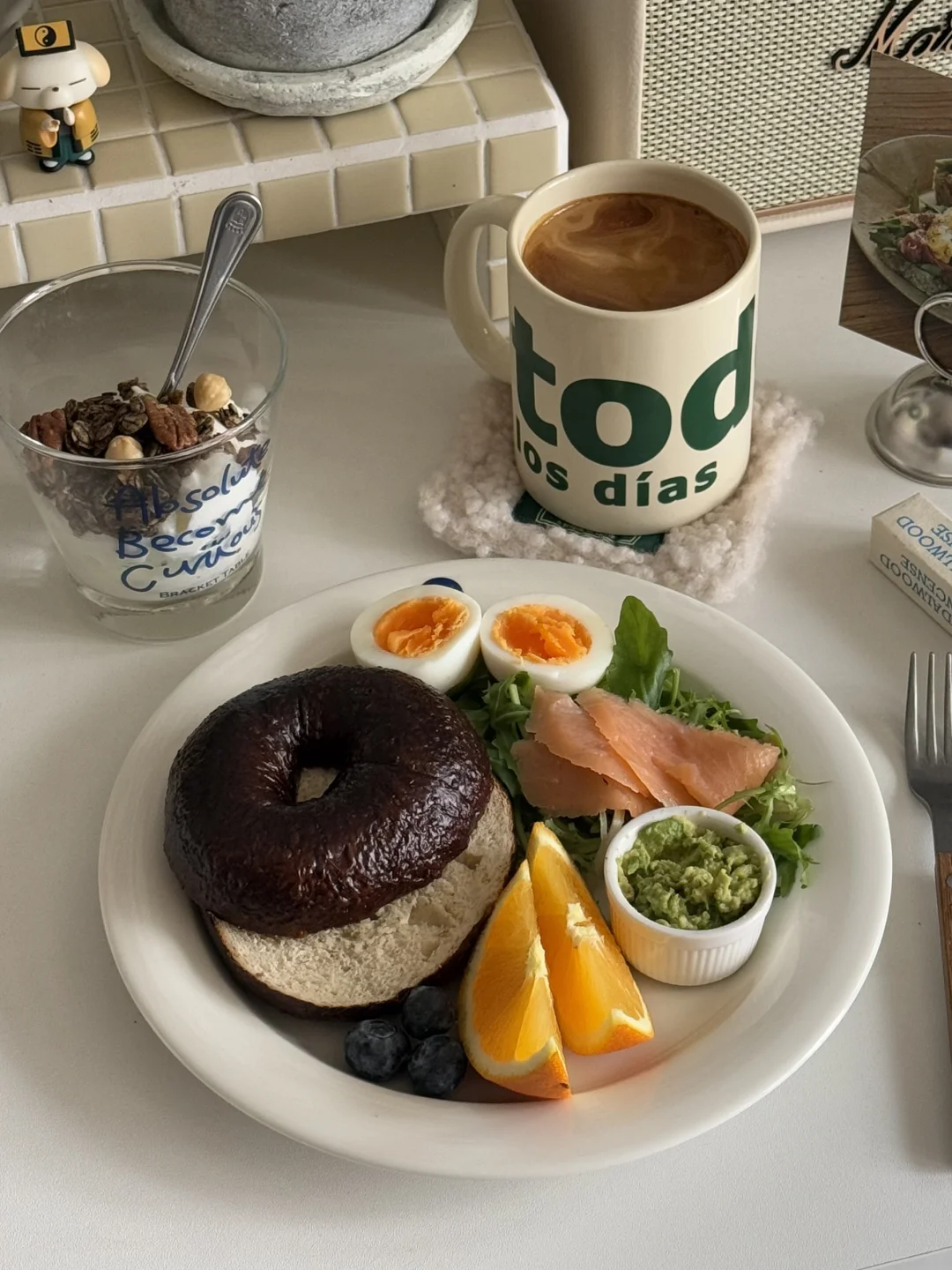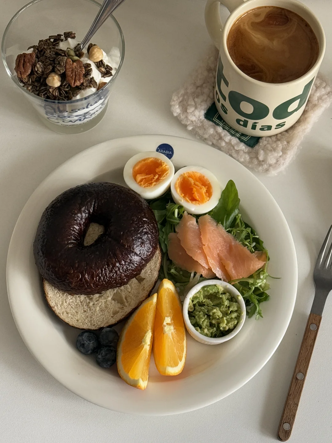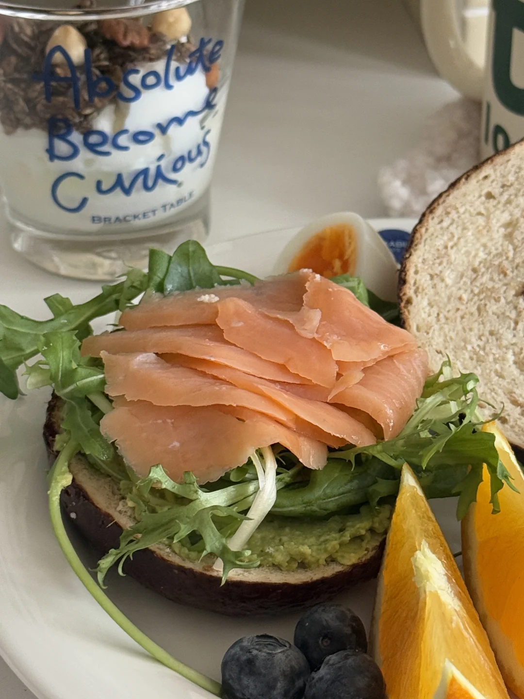 试了7分11秒和9分11秒的水煮蛋 感觉只要是品质好的新鲜蛋🥚 煮出来都好吃的[赞R] - 黑麦碱水贝果涂了🥑泥 加了芝麻菜和苦苣 吃不惯烟熏三文鱼 感觉腥味被🔍 -