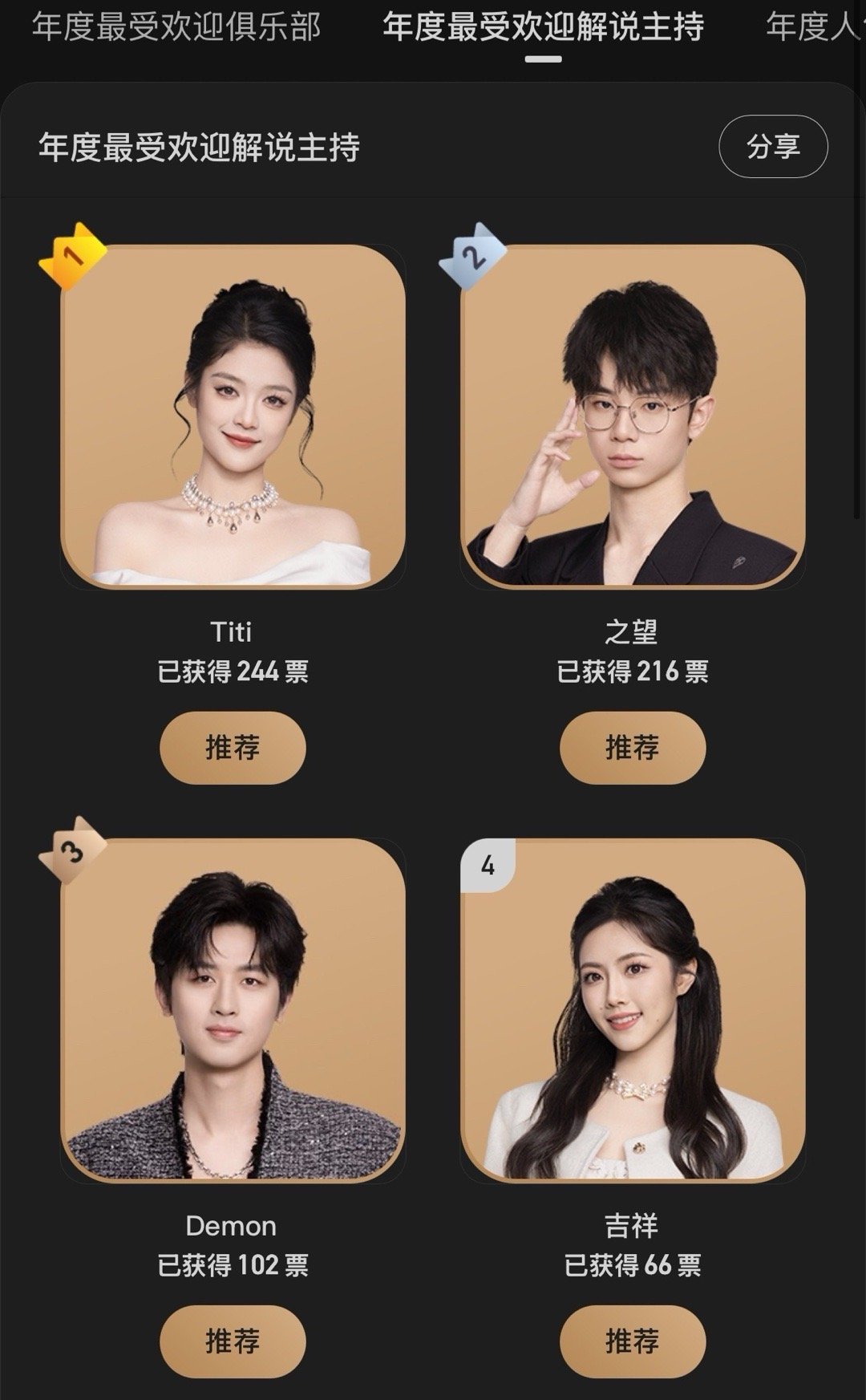 2025年度最受欢迎解说主持那些让你拍桌叫绝的点评、热血沸腾的呐喊,都值得被铭记。一起为年度人气解说主持助力!