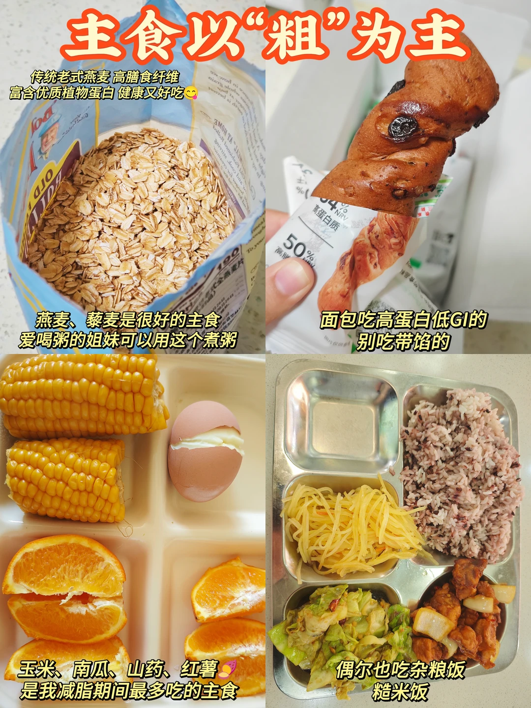 ✅ 主食换“粗”的:糙米、藜麦、玉米、山药,每餐一拳量,千万别不吃碳水!