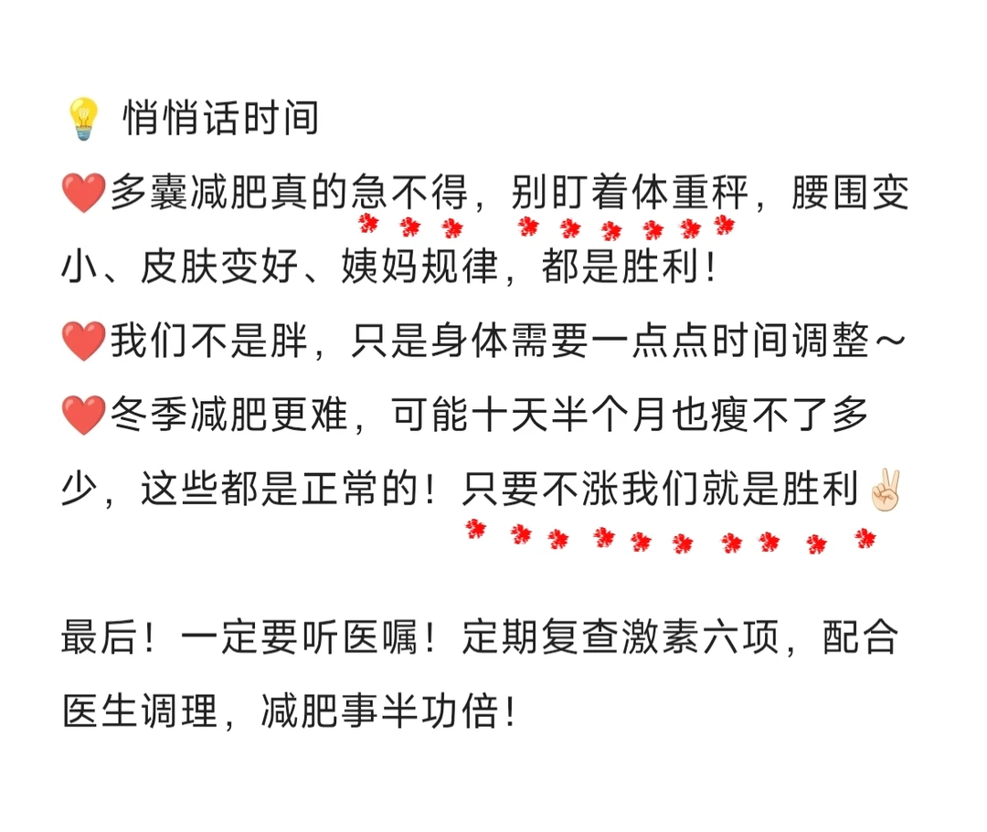 ❤️多囊减肥真的急不得,别盯着体重秤,腰围变小、皮肤变好、姨妈规律,都是胜利!