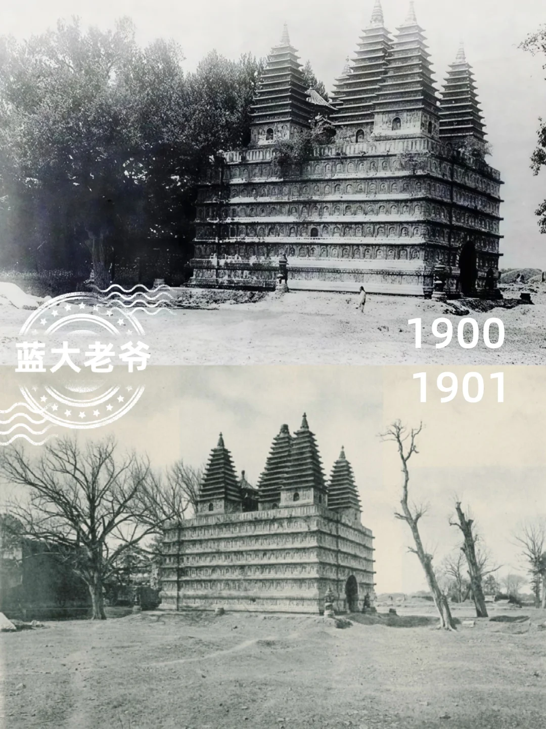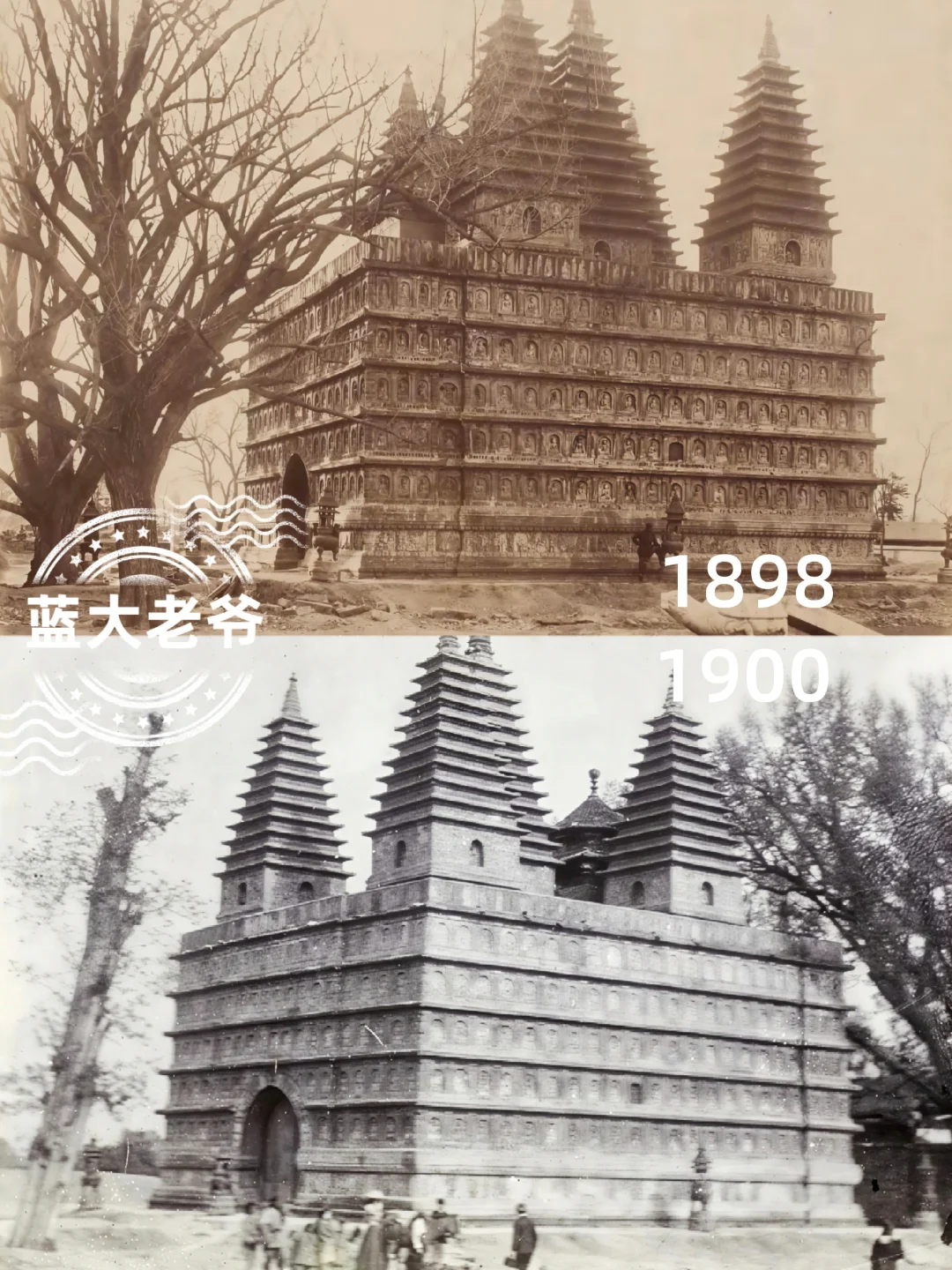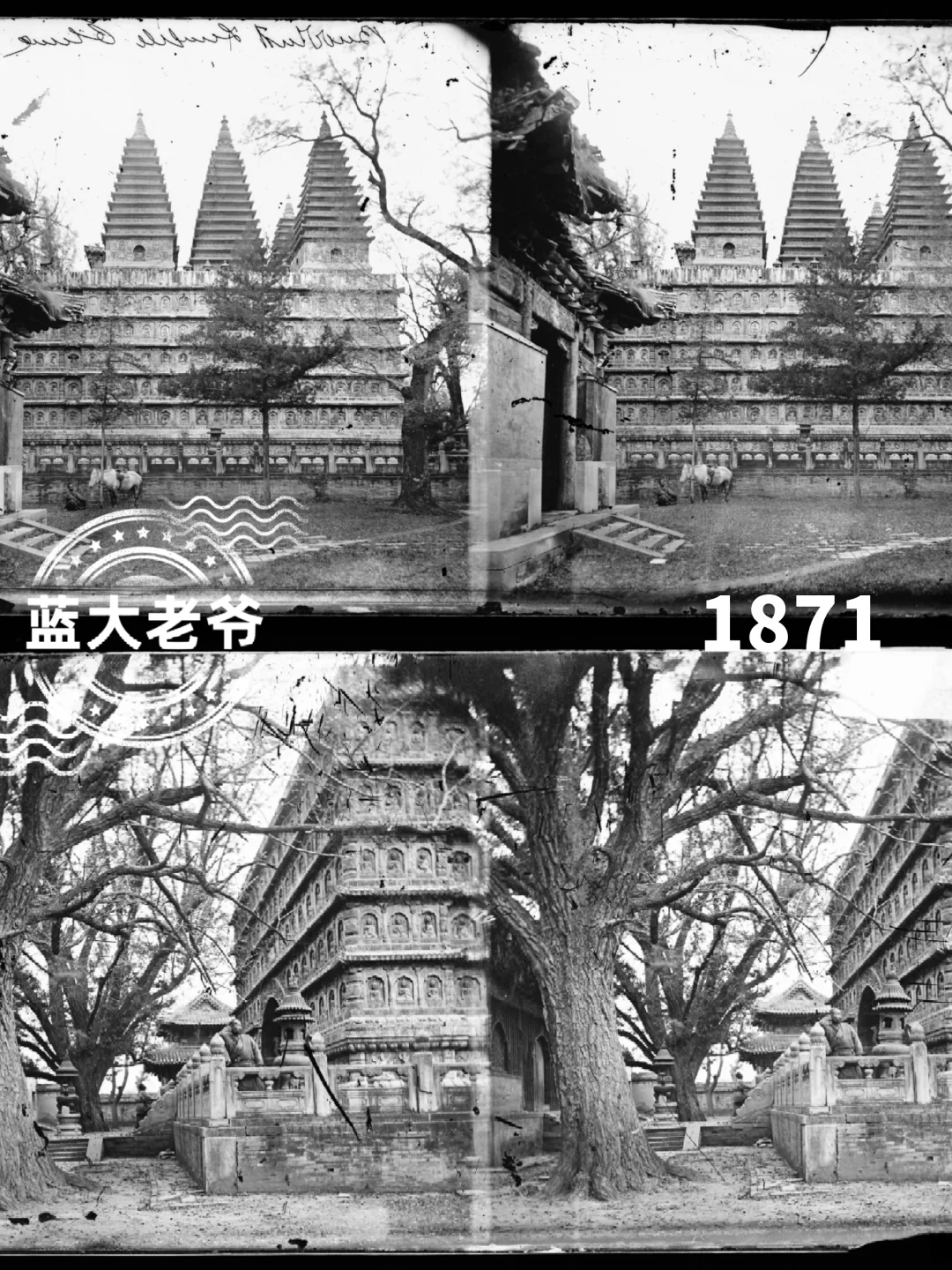 🌄有几个道友群,潜水不言只随看学习,此前看群讨论一张五塔寺旧影视角,这是清同治朝(约1871)苏格兰旅行家&摄影先驱约翰•汤姆逊所拍两张立体照片中的一张,五塔寺现存旧影之最早,其时尚存大殿碑亭建筑,也曾比对拍摄过,以前发过一集,再作集分享旧影。