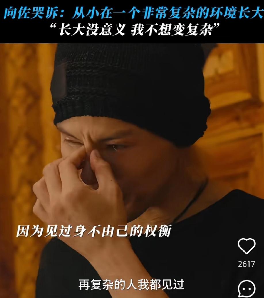 发现没,向佐这个人, 别的什么都好, 但是有一点,他从不自知,可能永远也改不掉,那就是都说他抽象,但是我觉得他有可能是知世故而不世故,这才是最难得的。 向佐在节目里面坦言,说自己从小在一个复杂的环境中长大,长大没有意义,他觉得他们都很恐怖,他不想变得复杂。 说着说着就开始流眼泪了,感觉向佐的内心很纯净,抽象是他的保护色,或者是从小被家庭保护的太好了, 之前看湖南一个综艺《变形记》,杜华的儿子赵小果也在节目里,虽然赵小果胖胖的,但是节目里能看出来,孩子家教很好。 其实有很多富豪的家庭,小孩从小被保护的很好,就是三观很正的那种,没有什么坏心眼,没有那么多复杂的情绪,其实他们内心很简单的,向佐这种类型估计还是被向太保护太好了!