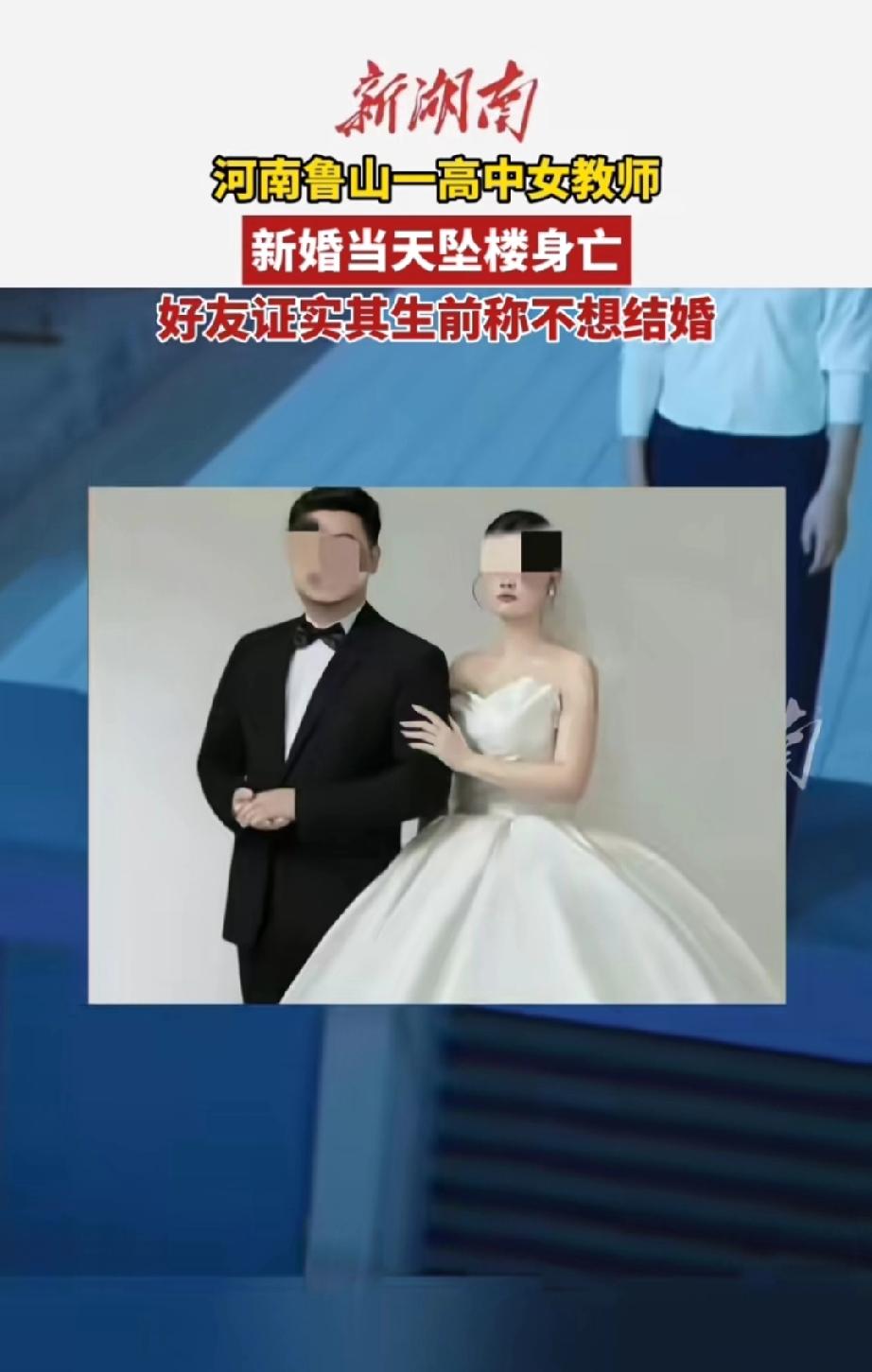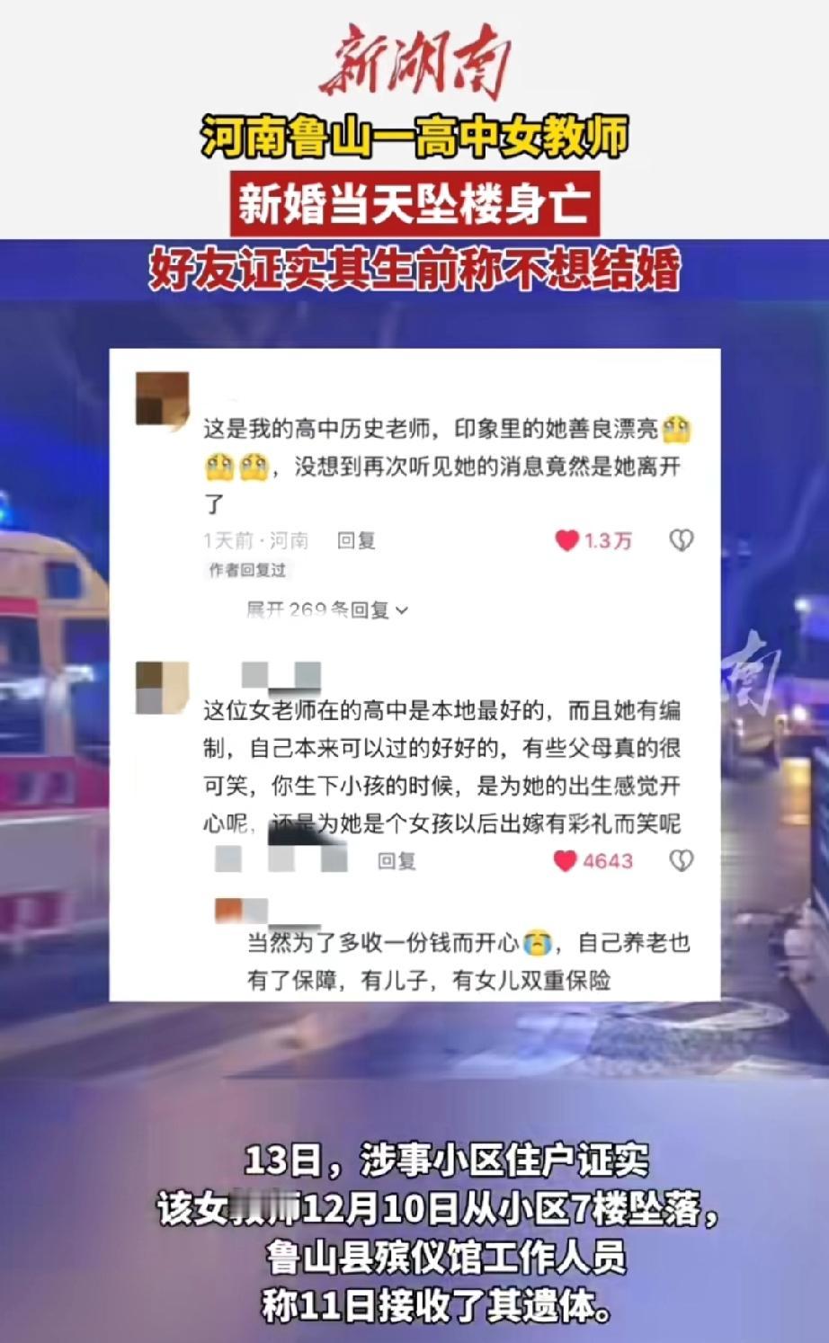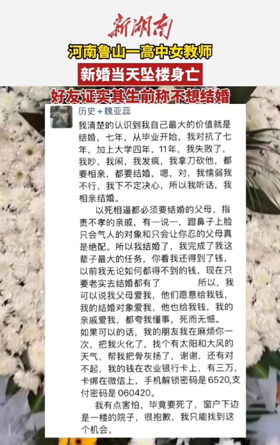 河南鲁山,28岁女子抵触结婚,在婚礼当天从七楼纵身跳下,跳楼前还在微信朋友圈留下遗言:找个有阳光和大风的日子,把我的骨灰扬了。 女子是一名高中历史老师,她表示,自读大学开始,父母便开启催婚模式,大学毕业后更是逼婚长达七年,甚至以死相逼。他们逼迫她去相亲、结婚。她奋力反抗却毫无成效,只能顺从,亲戚都夸她孝顺,父母还给了她钱。大概给的是嫁妆,这是她提前得不到的。 相亲结识的男友很爱她,也给了她钱,这笔钱或许就是聘礼。 女子为何不愿结婚?是心有所属却爱而不得,还是本身就是对婚姻不抱期望的“不婚族”? 从女子的决绝能看出,她没感受到父母的爱,心中也无所爱。而且仅本科学历就能当上高中历史老师,这在大城市极为少见。 从她的经历来看,她并非网传的28岁,应该有三十几岁了。 她对一楼邻居说“抱歉”,说明心底尚存一丝善良。 然而,说抱歉容易,邻居却要背负一辈子的心理阴影,这不是一句抱歉就能解决的。 活着才是根本,生命最值得珍惜,以死抗拒父母逼婚,这行为何其愚蠢。她对父母的养育之恩毫无感激,只有满心埋怨。 “蹬鼻子上脸”的结婚对象,让你忍的父母,这是她留下的最后的指责。 事情发生在12月10日。如今女子应该已经火化了。达成自己的愿望“死而无憾”。 有人说过,跳楼的人在坠落的过程中,已经后悔了。不知女子有没有后悔。 婚姻并非人生必选项,缘分到了自会水到渠成。结婚未必幸福,单身也未必孤独。真正的幸福,向来源于内心的选择与感受。 这件事,也给现在的家长上了一课,给孩子婚姻自由选择权,不给孩子添堵 也让自己活的舒坦。 来源:新湖南