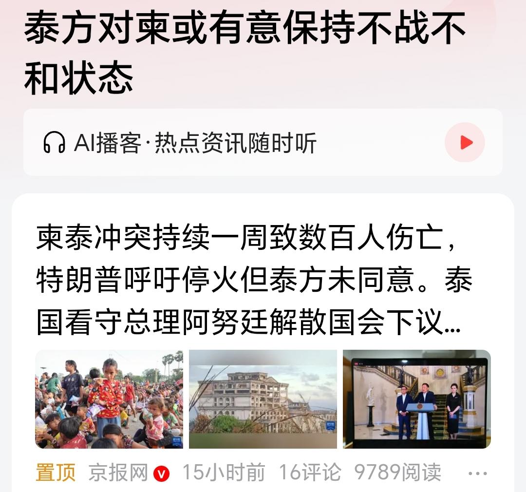 猜猜,为什么这次柬埔寨挨打没有国家站出来帮柬埔寨说话了呢?因为洪森父子的信用破产了。 政治很多时候需要公开的表态,但是更多的是私下的协调与交易。洪森表面上摆了他信家族一道,实际上以后再也没有国家敢信任他,因为你不知道他什么时候会把私下的协调和交易公之于众。 他以为他只是得罪了泰国政府中的他信家族,其实他得罪的是泰王、泰军和泰国政府。 这样的情况下,泰国还会有谁帮他们说话? 其实在东南亚真正能说得上话的是中国,不是美国。 洪玛奈以为搞大国平衡很容易,现在看来也是被美国民主党忽悠瘸了。 洪森父子对柬埔寨的国家定位错了。他们没有资格玩大国平衡外交。他们唯一的出路是抱紧中国大腿,学学巴基斯坦吧,现成的例子不学,非要自以为是。 守成也不会做。 泰国现在都不理睬特朗普,明显是有人撑腰嘛。 洪森现在能做的不是和泰国谈判,是做这三件事:1、扶南运河持股比例主动降到40%;2、消除所有电诈园区;3、洪玛奈引咎辞职,和柬埔寨国王协商,还一部分权力给国王。 只有这样,洪森家族也许可能免遭劫难,否则,这次在劫难逃。 不信看。 点右上角关注我,我们一起去看这个魔幻的世界