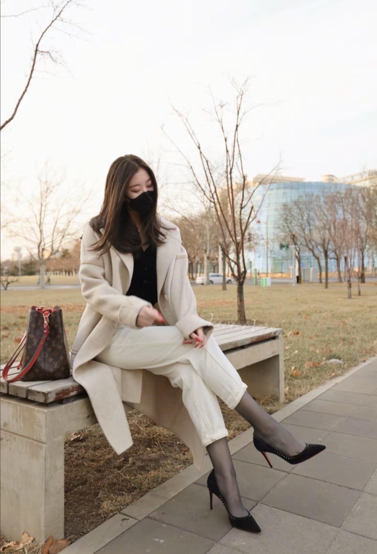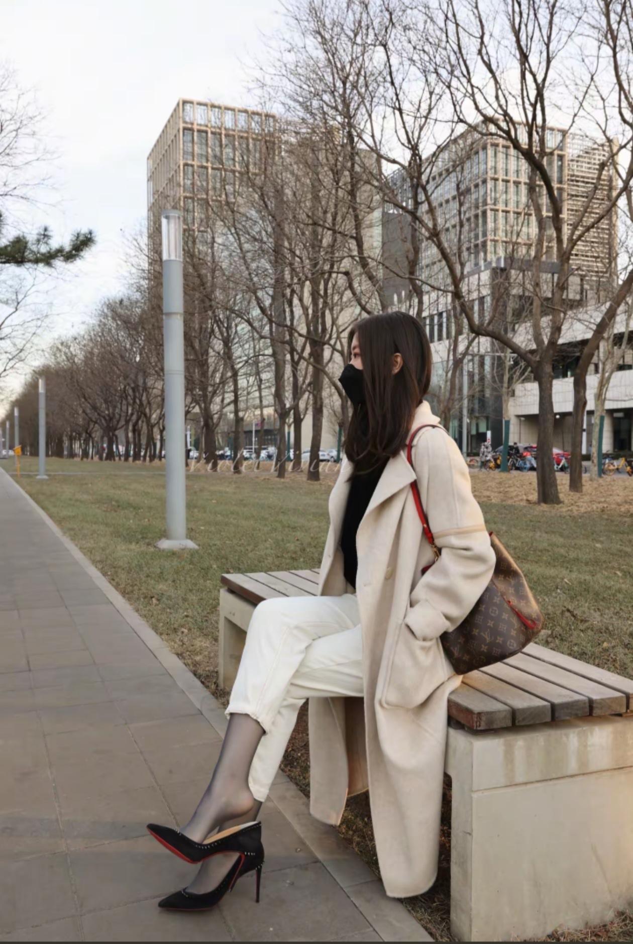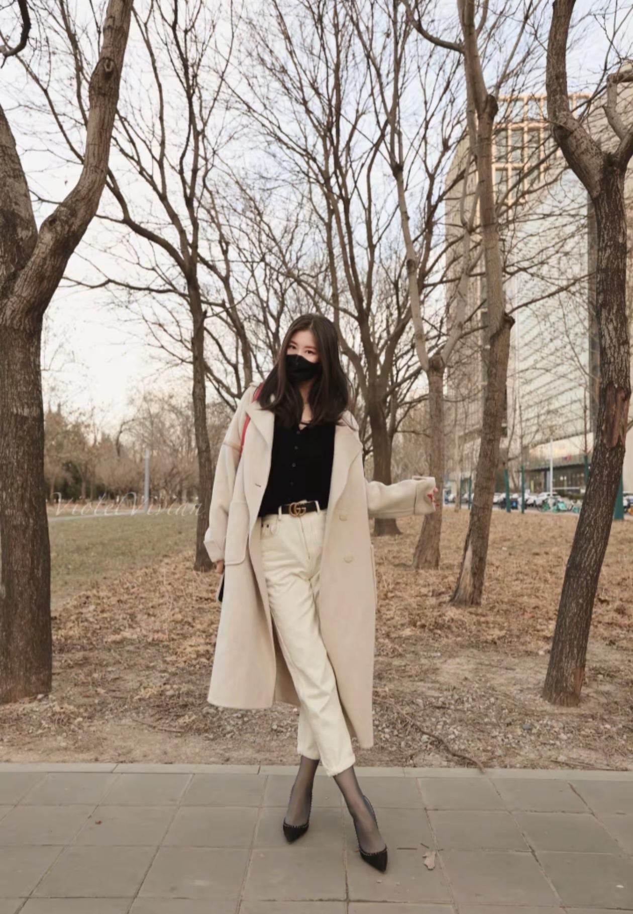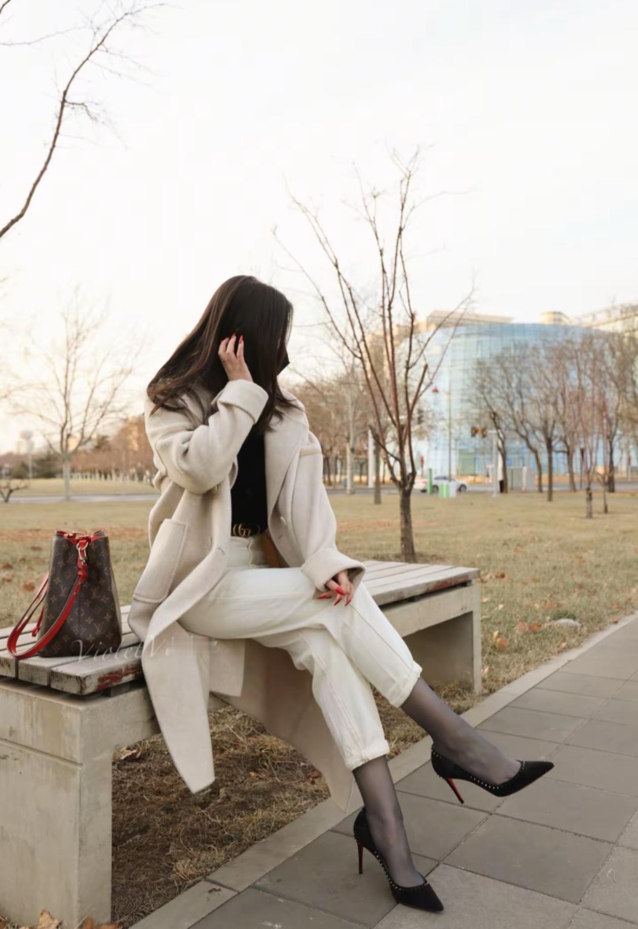 白色呢子大衣,白色裤子,黑色高跟,好搭