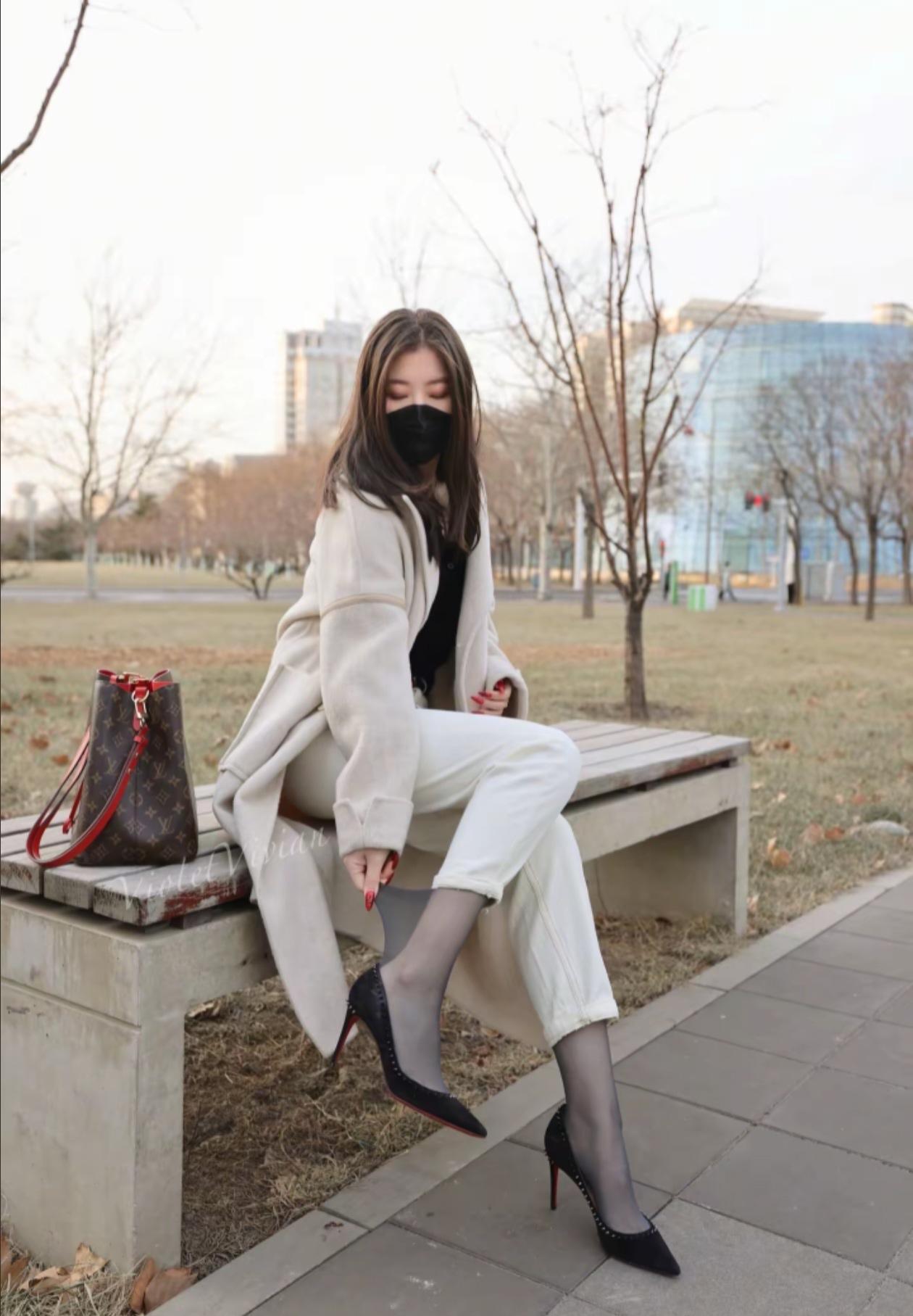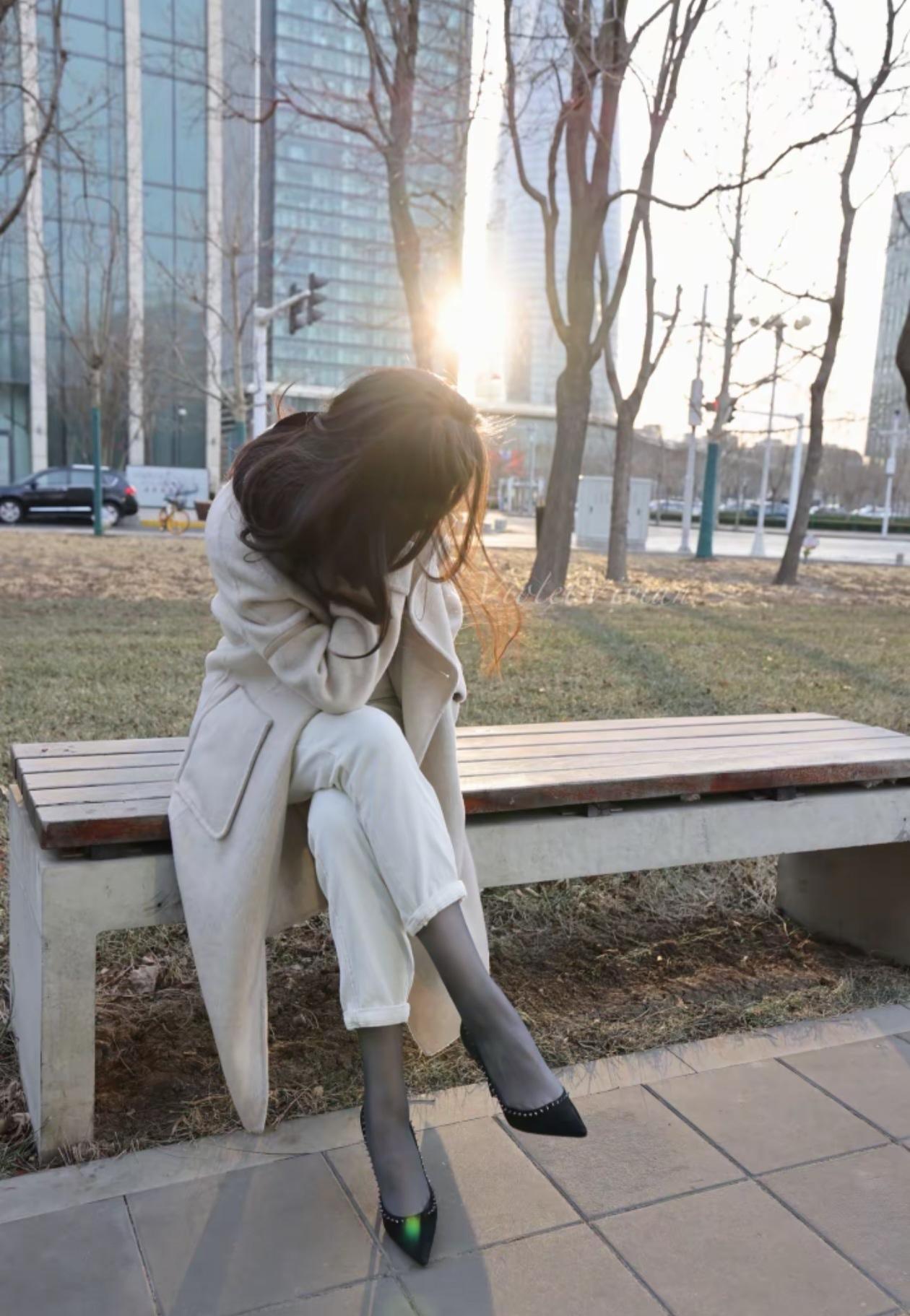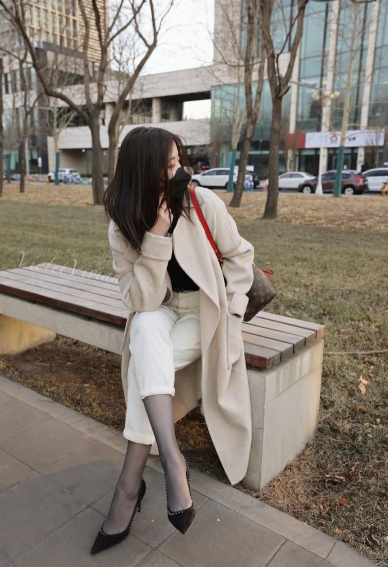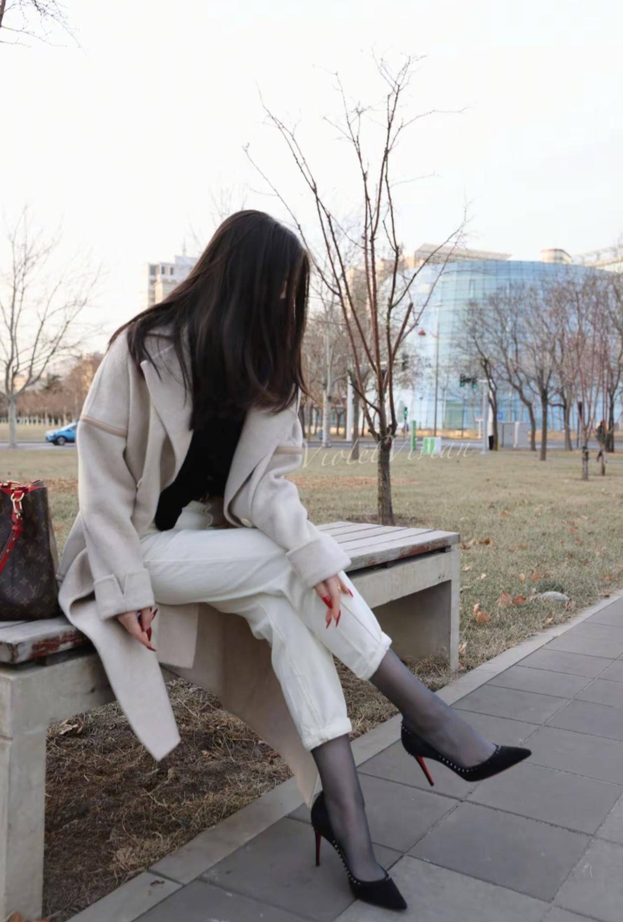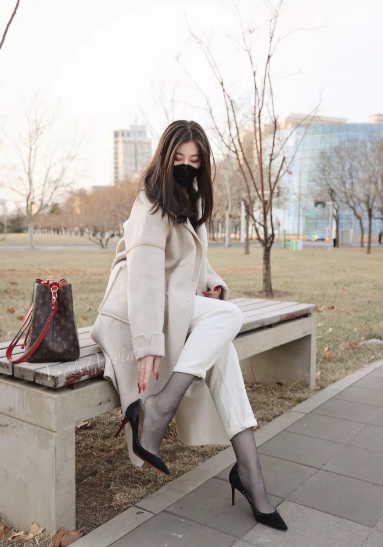 白色呢子大衣,白色裤子,黑色高跟,好搭