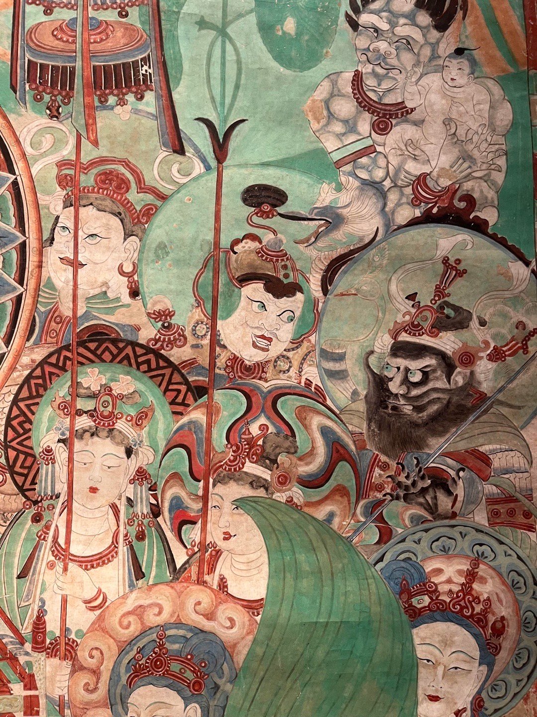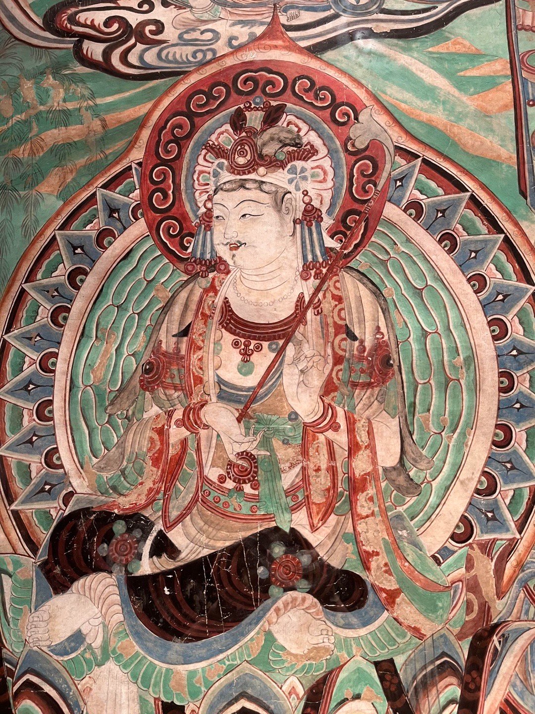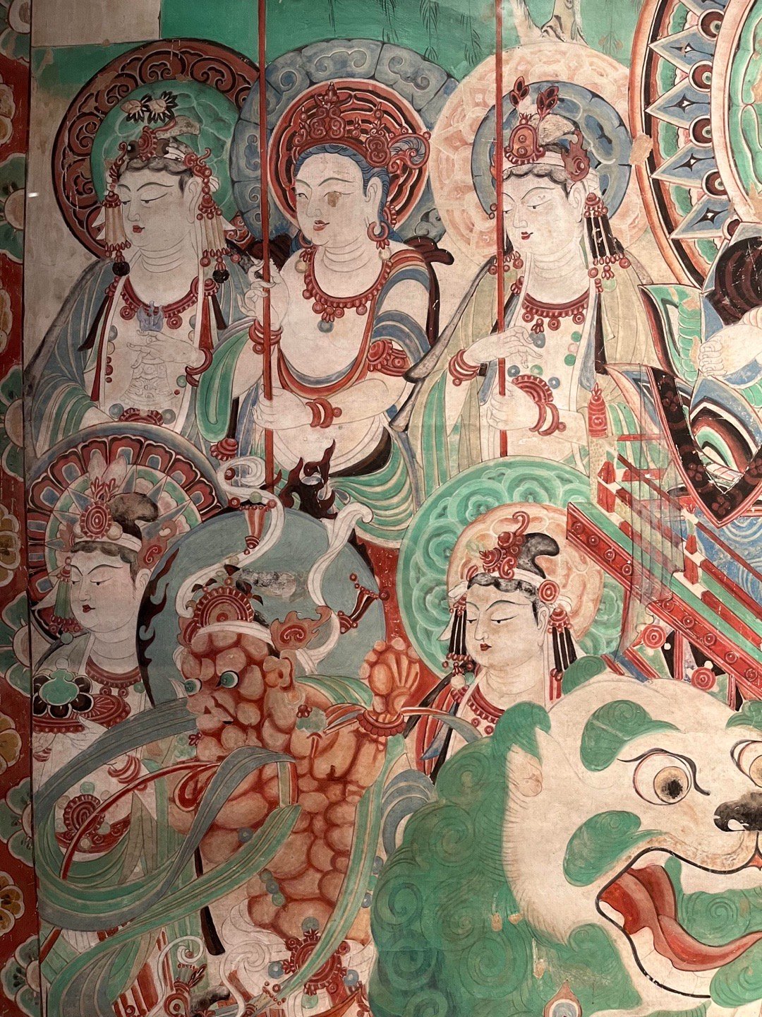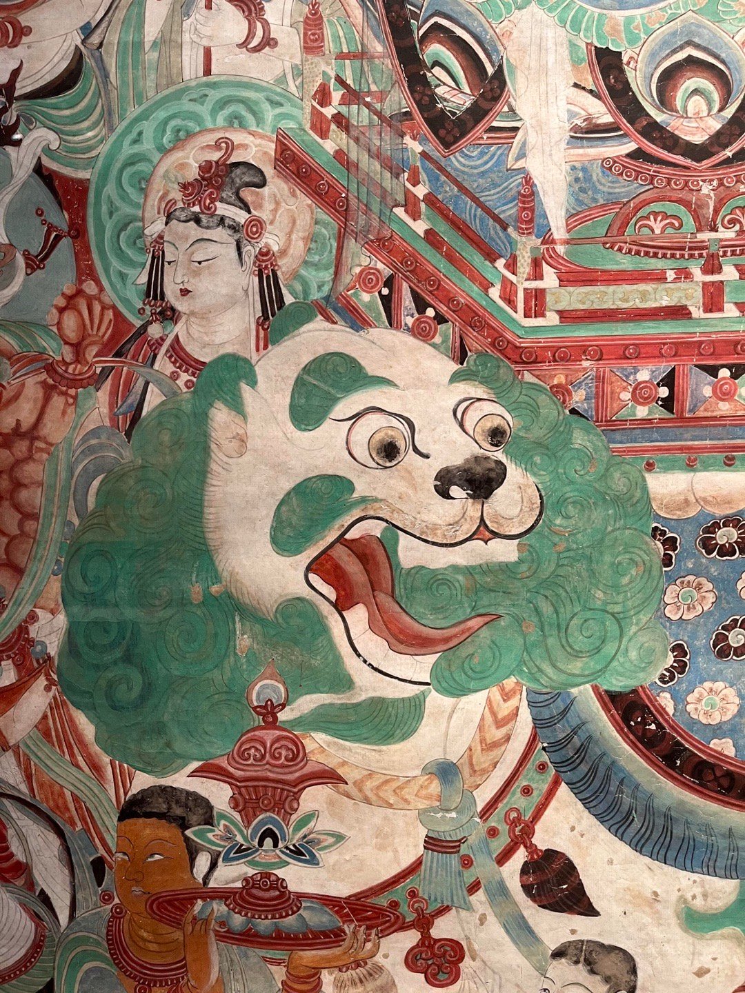 敦煌壁画 | 莫高窟159窟·中唐《文殊变》敦煌研究院藏,李秀华临摹。文殊变代表作之一,位于莫高窟第159窟西壁帐门北侧。吐蕃统治晚期绘制,保存完整,以结构宏伟、描写精细著称,与相对的普贤变同属敦煌艺术珍品。主尊文殊, 安坐狮舆莲座上, 手执如意, 神态安详;坐狮绿色鬣尾, 白色躯体,转头与绾缰执杖的棕肤驯驭者瞠目相向,生气勃勃. 四周扈从巡行的帝释、乐队、供养菩萨、天龙部众,形象秀美,各具性格。在高耸的幢盖后面,铺着一片翠绿的湖水,上浮峰峦陂岸、远岑烟树,极富空间感,各种人物形象,描写细腻,不但面颜姣好,连奏弄乐器的眼神、口型和焚香、献花的手臂指节,都刻意求工,十分生动。画面上飘垂的披巾,蠕动的云彩,在绵密的线条与响亮的色彩组成气氛中,像一阕变化丰富而又和谐的交响乐,是敦煌艺术中期的杰作。