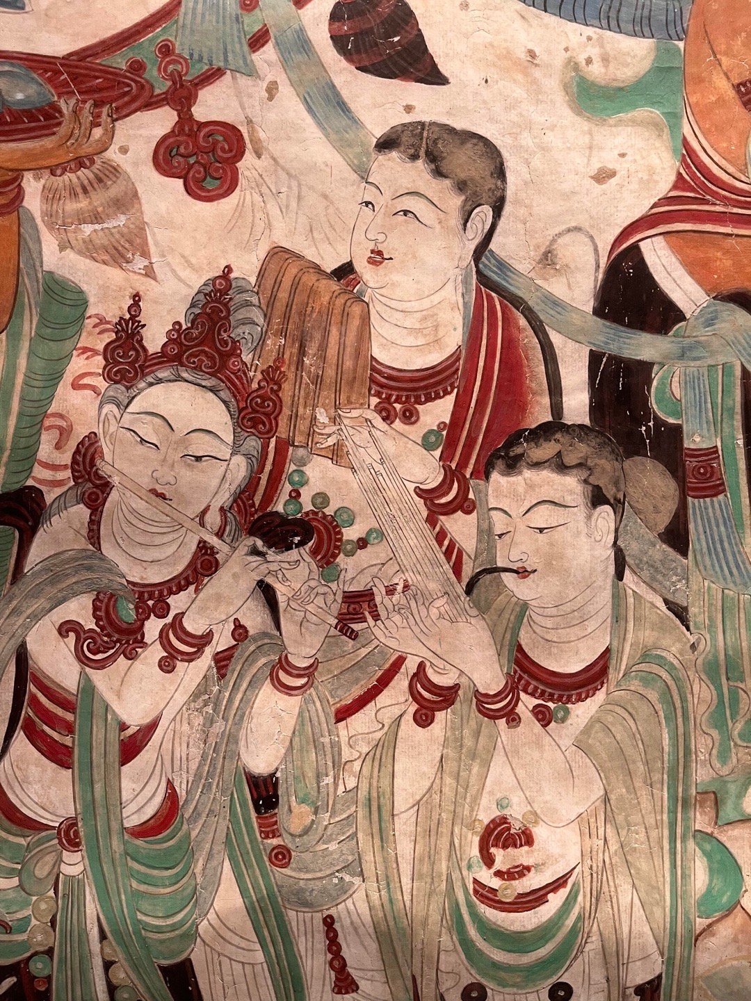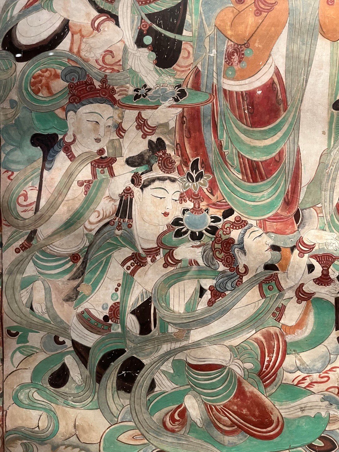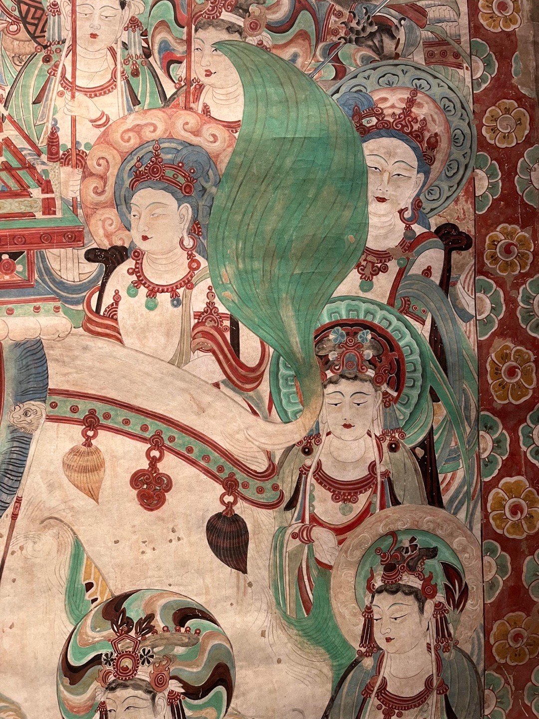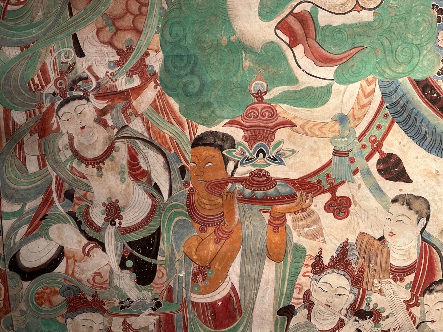 敦煌壁画 | 莫高窟159窟·中唐《文殊变》敦煌研究院藏,李秀华临摹。文殊变代表作之一,位于莫高窟第159窟西壁帐门北侧。吐蕃统治晚期绘制,保存完整,以结构宏伟、描写精细著称,与相对的普贤变同属敦煌艺术珍品。主尊文殊, 安坐狮舆莲座上, 手执如意, 神态安详;坐狮绿色鬣尾, 白色躯体,转头与绾缰执杖的棕肤驯驭者瞠目相向,生气勃勃. 四周扈从巡行的帝释、乐队、供养菩萨、天龙部众,形象秀美,各具性格。在高耸的幢盖后面,铺着一片翠绿的湖水,上浮峰峦陂岸、远岑烟树,极富空间感,各种人物形象,描写细腻,不但面颜姣好,连奏弄乐器的眼神、口型和焚香、献花的手臂指节,都刻意求工,十分生动。画面上飘垂的披巾,蠕动的云彩,在绵密的线条与响亮的色彩组成气氛中,像一阕变化丰富而又和谐的交响乐,是敦煌艺术中期的杰作。