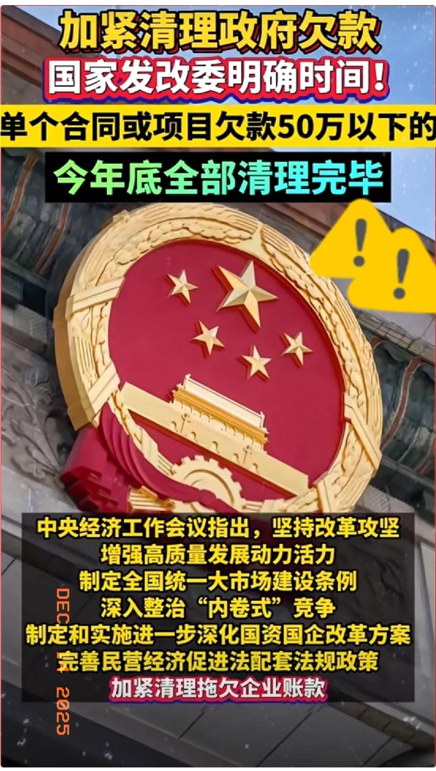 好消息! 12月13日 发改委直接拍板:单个合同50万以下欠款,2025年底前全清零! 做工程、搞供应的小老板们,看到这消息是不是瞬间红了眼?以前要账堪比求爷爷告奶奶,对方不是说“走流程”就是“资金没到位”,一拖就是好几年。 对大单位来说,50万可能不值一提,但对咱们小微企业,这可是实打实的救命钱——是给工人发工资的钱,是交房租、进原料的钱,是全家老小的生计钱。 只盼执行能到位,别搞“以资抵债”“打白条”,真金白银到账才管用。小微企业撑住了,市场才活泛。有被拖欠欠款的老板吗?评论区说说你的情况,一起等这笔救命钱落地!