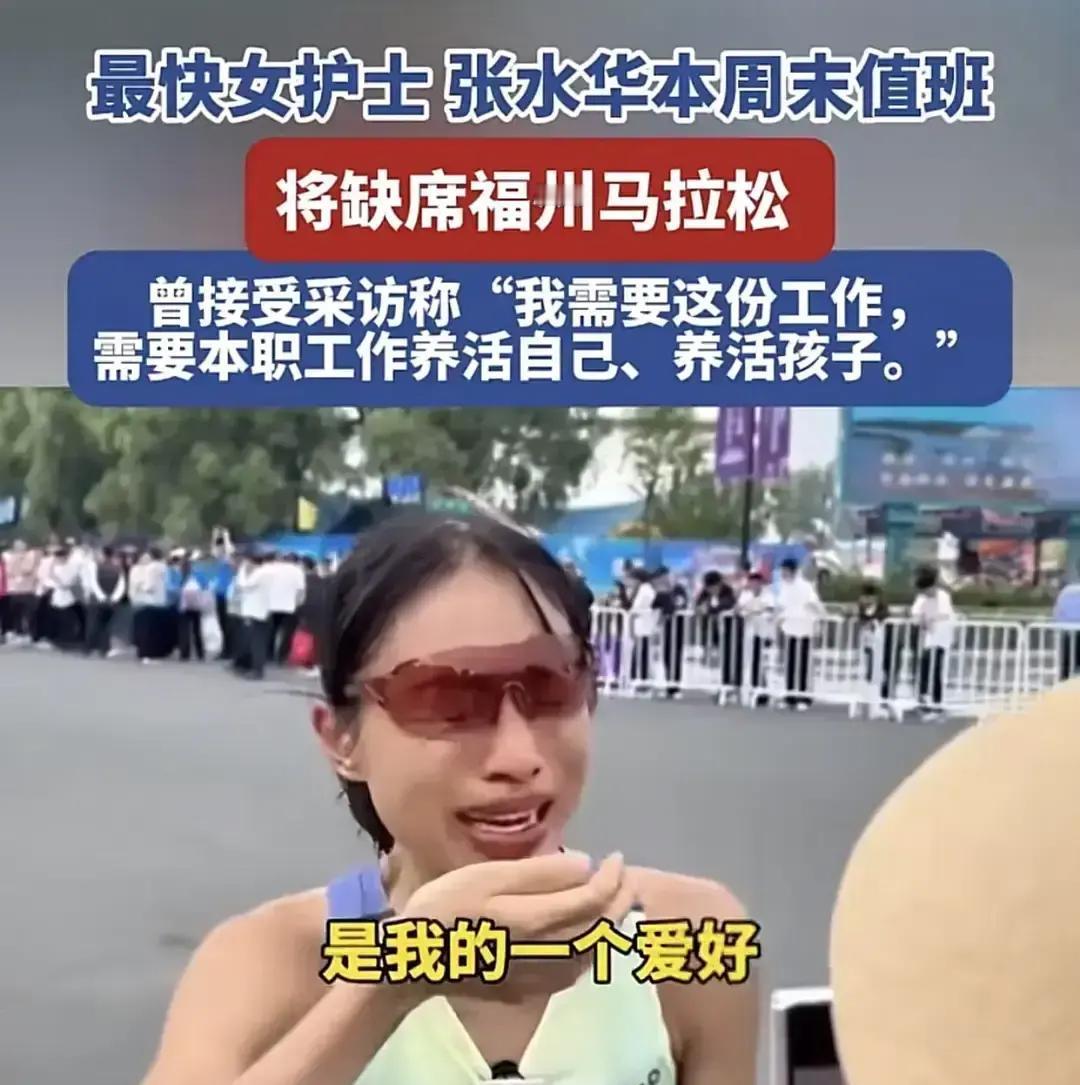 张水华跑不了福州马拉松了。 单位给的处分,看来真起作用了。 她终于说心里话了。单位里有人嫉妒她,她从来没想过全职跑马拉松,这就是个副业,还得靠护士的工作养孩子过日子呢。 调班是正常操作,不是无故不来上班。之前请假院方都批了,现在迫于舆论才问责,院方自己也有问题吧。 护士工作本来就累,有点个人爱好怎么了。现在全民健身这么火,该引导不是打压,别动不动就拿解雇说事。