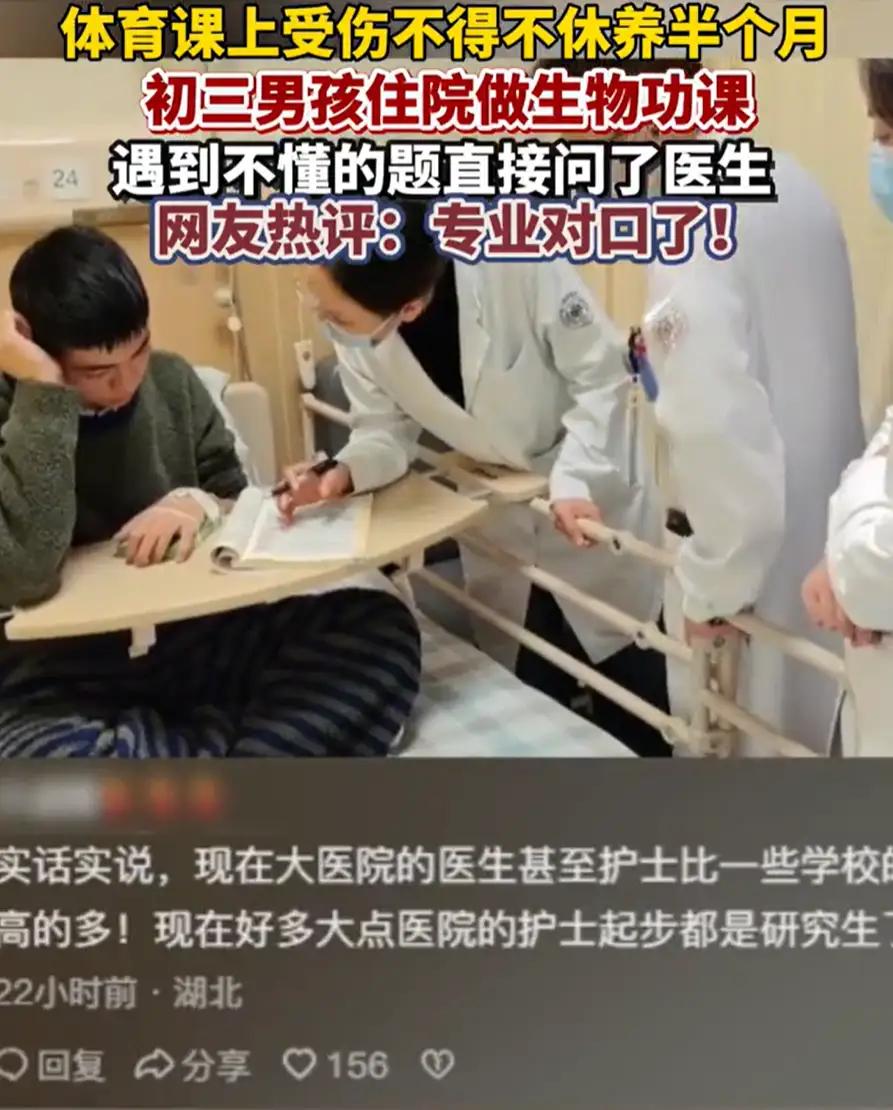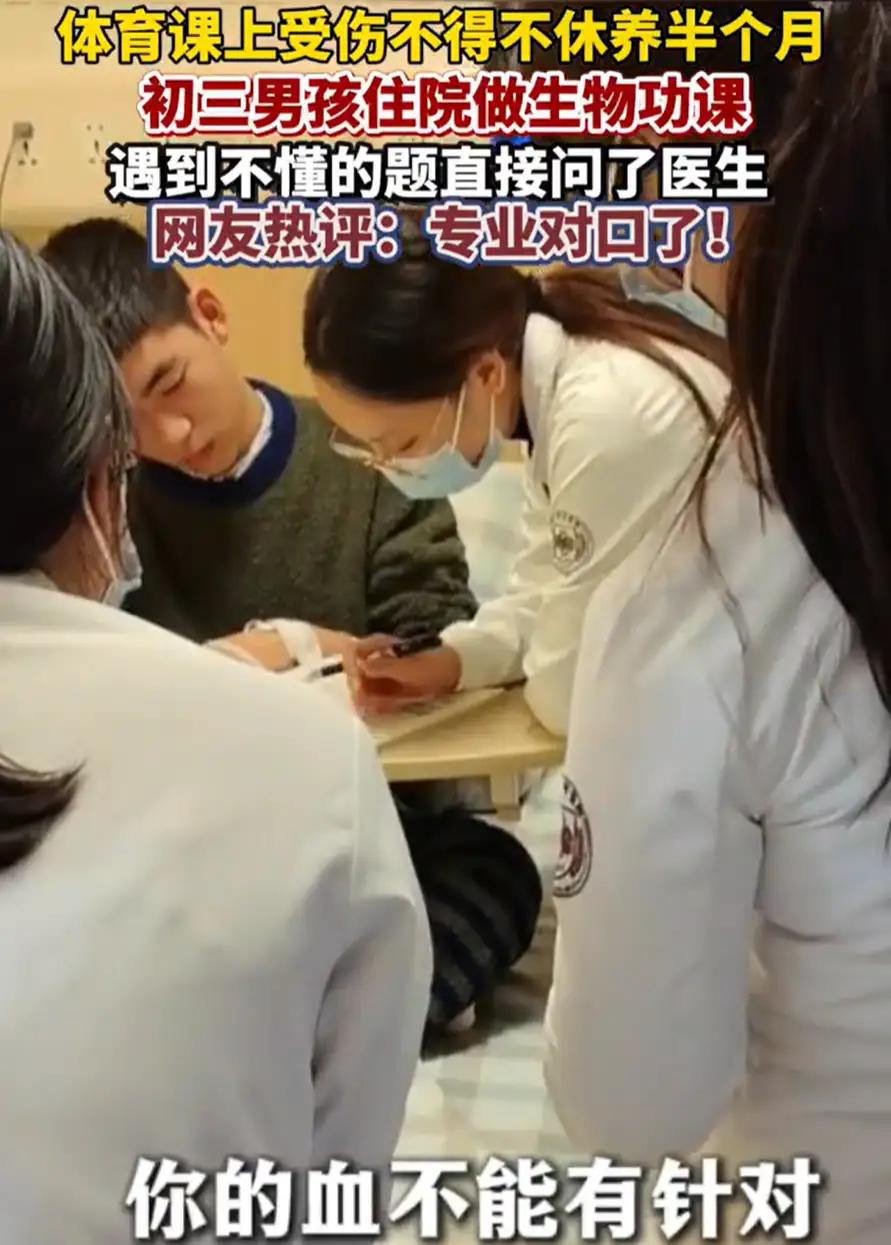 专业对口了!浙江杭州,一名初三男生受伤住院,在做生物作业时遇到困难,就随口问了句女医生,没想到,医生听到题目后立刻解答,又快速又准确,网友:记得把辅导费算在住院费里 病房里扎着输液针的初三男孩,低头对着生物题皱紧眉头,白大褂医生俯身讲解的模样,倒比家教还耐心。这一幕,感动无数网友。 男孩上体育课意外受伤,得卧床休养半个月。闲不住的他翻出生物作业,卡在血型抗体的题目上犯难,扭头就问了查房的女医生。 没人料到,医生没半点敷衍,靠着病床俯下身子,用最直白的话拆解:“你是A型血,血液里不能有对抗A型血的‘抗A’,就像不能自己跟自己较劲,懂了吗?” 男孩盯着题目频频点头,眼里的困惑一点点散了。一旁的父亲拍下这一幕,发到网上瞬间炸了屏。 网友的评论戳中人心:“能考上好医院的医生,当年高考都比一本线高五六十分,211、985的顶尖学霸才够格,初中生物题对他们就是常识。” 更有人说:“学霸未必是医生,但医生一定是学霸。”这话半分不掺水。 医学之路本就是千军万马过独木桥,十几年高强度学习,海量知识从理解到熟记再到活用,早就刻进骨子里。生物题难不倒他们,难的是愿意放下忙碌,迁就孩子的节奏。 世人总觉得医生满脑子都是病历和医嘱,连喘口气的时间都没有。可真正专业的人,从不会缺共情心。 这位医生俯下身来讲解题目的模样,藏着学霸的底气,更藏着为人的善意。专业之外的温柔,才最让人动容。 病房里的几分钟讲解,不止教会孩子一道题,更让他懂了:真正厉害的人,从不是高高在上,而是愿意把知识化作光,轻轻递给需要的人。 这样的医生,既有救死扶伤的本领,又有温柔待人的初心,活该被全网点赞。