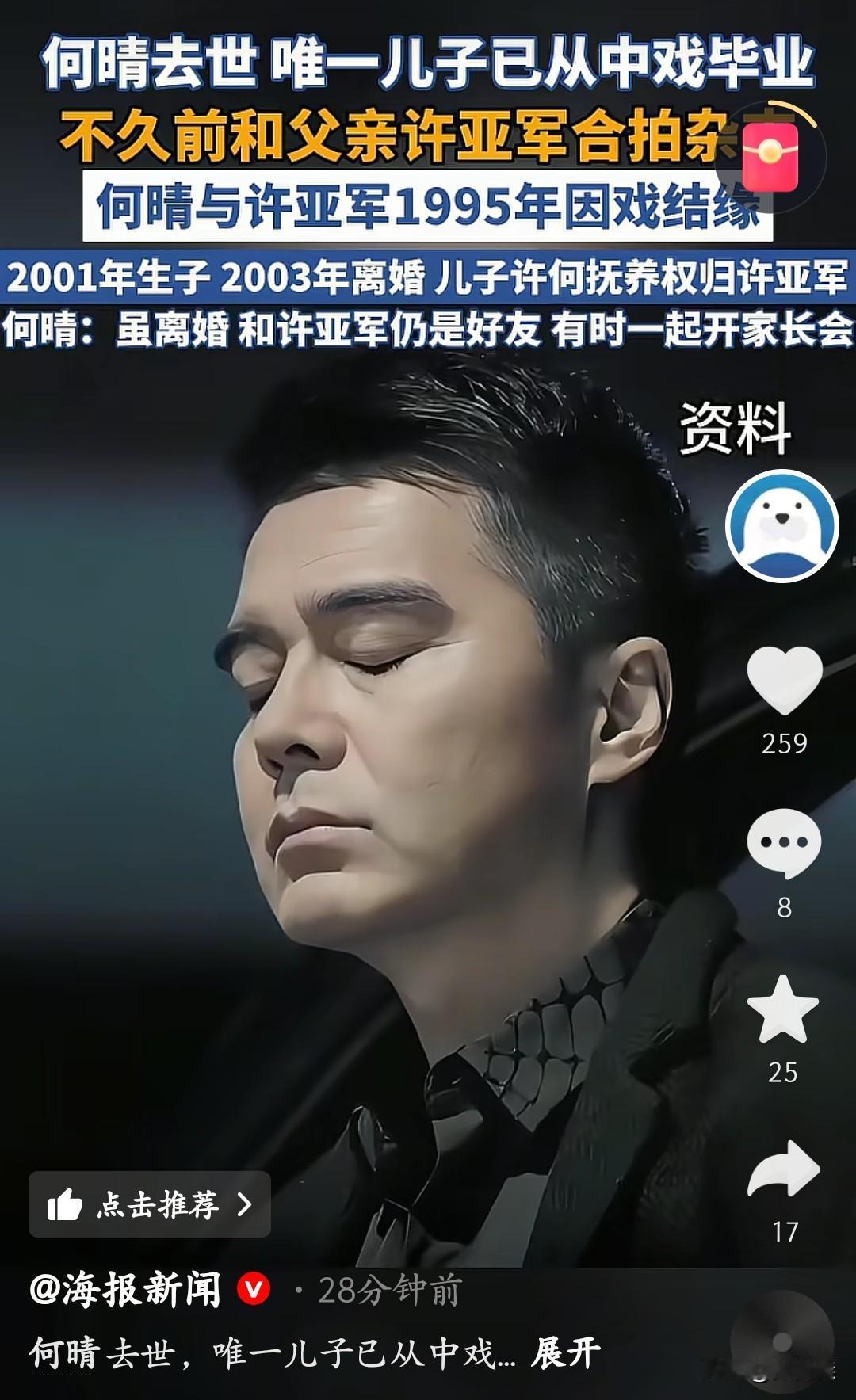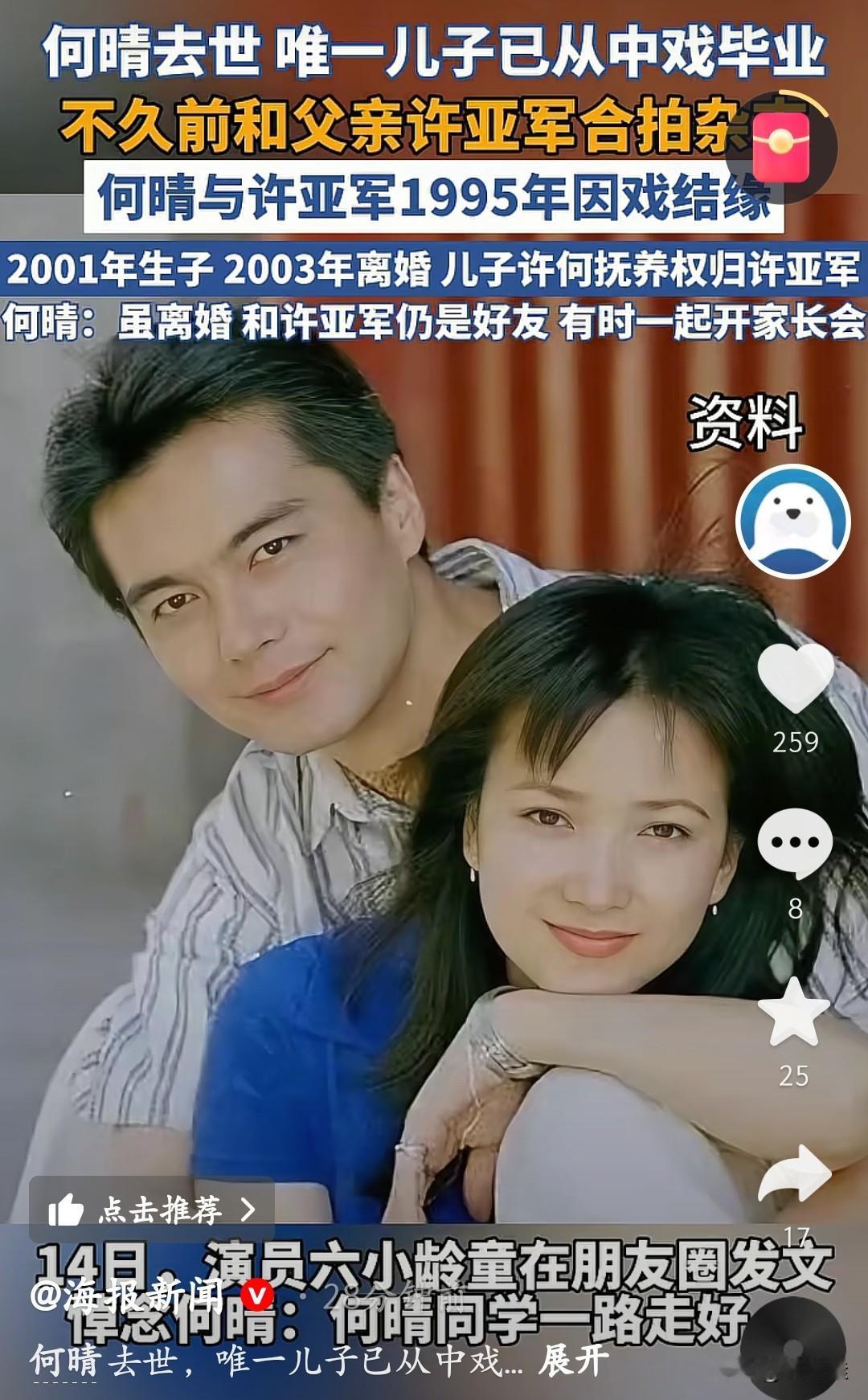 原来何晴的老公是曾是许亚军,就是《人民的名义》里的祁厅长啊!没想到这两位老戏骨还有过一段婚姻,1995年因戏结缘走到一起,2001年生了儿子许何,可惜2003年就离婚了,儿子抚养权归了许亚军。 如今何晴离世,享年61岁,她和许亚军的儿子也已经从中戏毕业,不久前还和父亲合拍了杂志。即便离婚,何晴曾说和许亚军仍是好友,甚至会一起开家长会,这份相处模式也挺难得的。六小龄童也发文悼念了何晴,愿这位塑造过无数经典角色的演员一路走好。