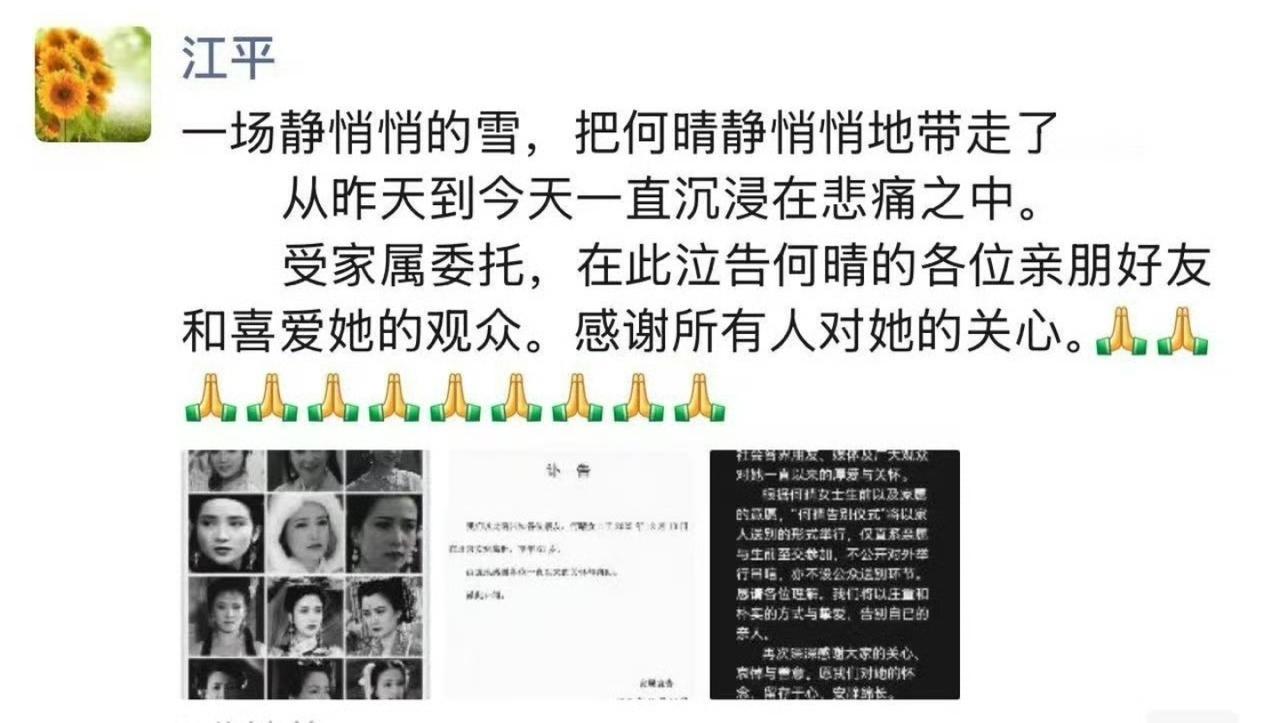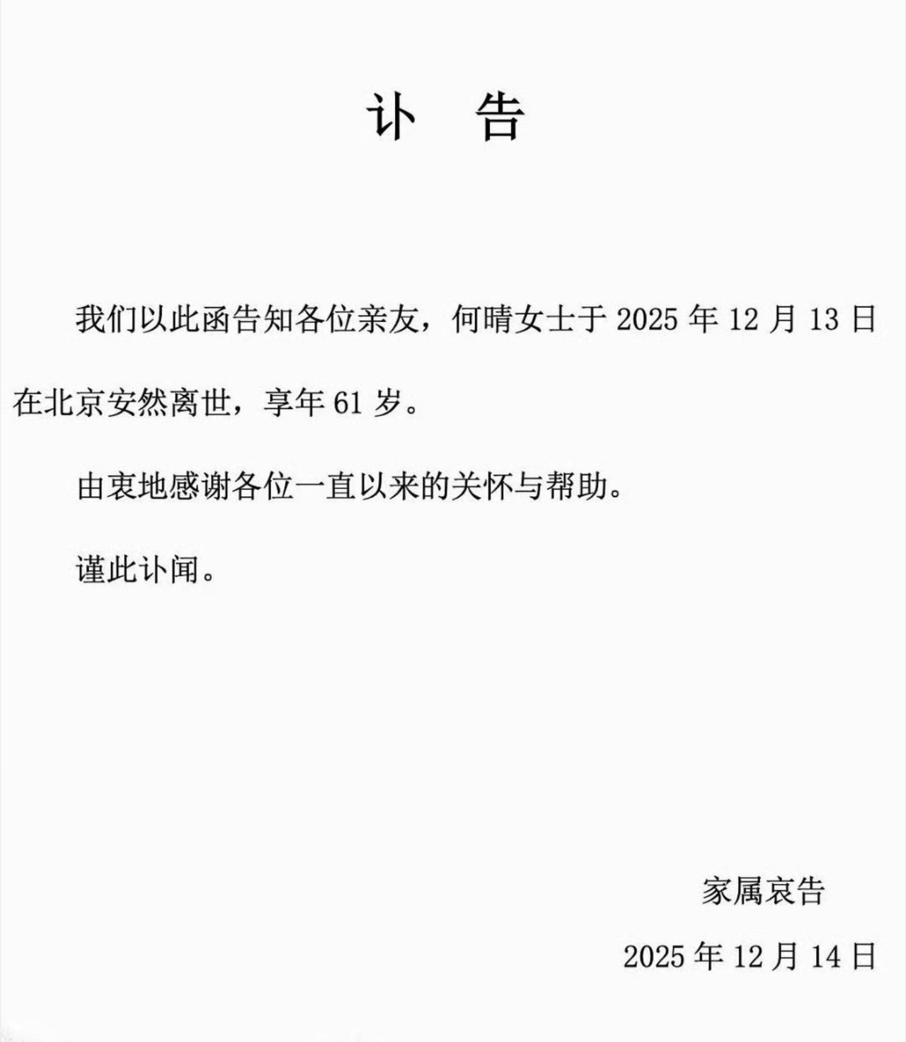 何晴家属再发讣告,称感谢媒体和广大观众的喜爱 但是根据何晴生前的意愿,告别仪式,仅仅是以家人送别的方式举行,直系亲属和生前至交好友参加,并不对外公布,也没有设置公众送别悼念的环节,希望大家理解。 印象中,这些年,很多我们耳熟能详的明星都离开我们了。 有些人风风火火,闹得大张旗鼓。有些人走的比较低调。 希望粉丝们也尊重和理解家属,不要过多的去围堵和拍摄。 所以说,在心里好好送别一场就行了。
