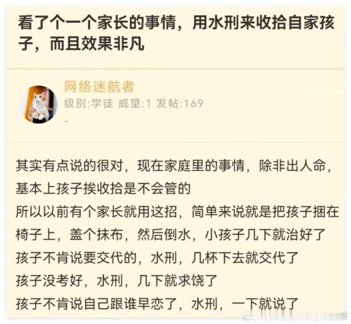 又认真看了这个陕西浇灌面汤,令妻子窒息身亡的案子。我百思不得其解的是,如果只是往脸上浇灌面汤(通报说是常温,浇灌至窒息而死),怎么会窒息而死,毕竟一大瓢面汤泼脸上大多数流走,何至于窒息?直到前几天在育儿博主的一个帖子下看到的截图,有不知性别的家长得意洋洋炫耀,说“水刑教娃”,不做作业早恋,水刑几次,全招了都变乖了。评论里都是骂的。两者一联系,就明白了这个妻子是有可能怎样窒息的。就这样,她的两个孩子还给凶残的爹出具了谅解。希望他们不会做噩梦吧。