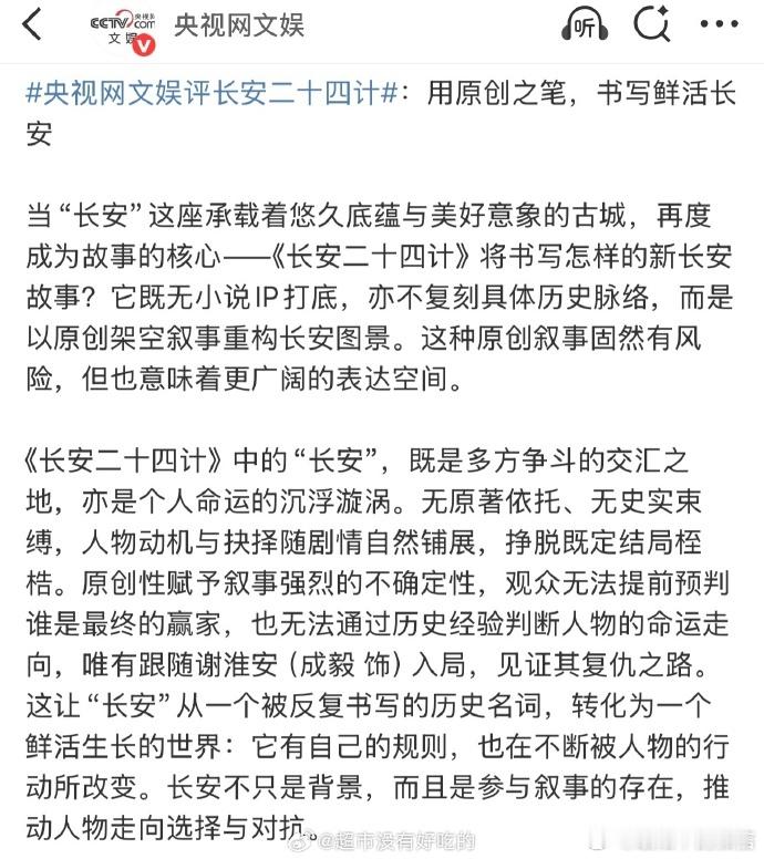 央视网文娱评长安二十四计长安二十四计《长安二十四计》靠原创基底撑住剧情,复仇主线抓睛,细节又满是诚意,上👖看真的能get到原创剧的魅力。