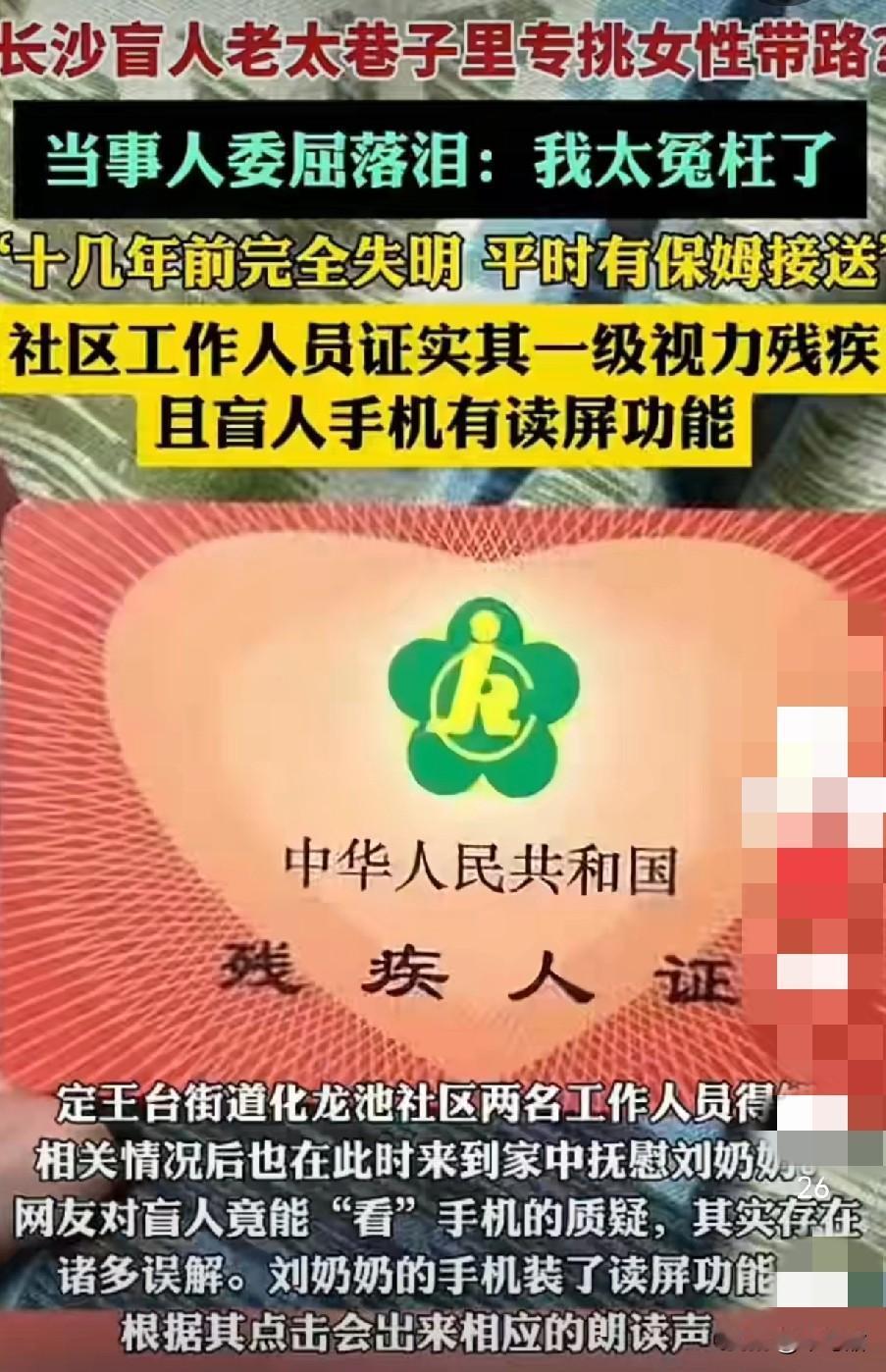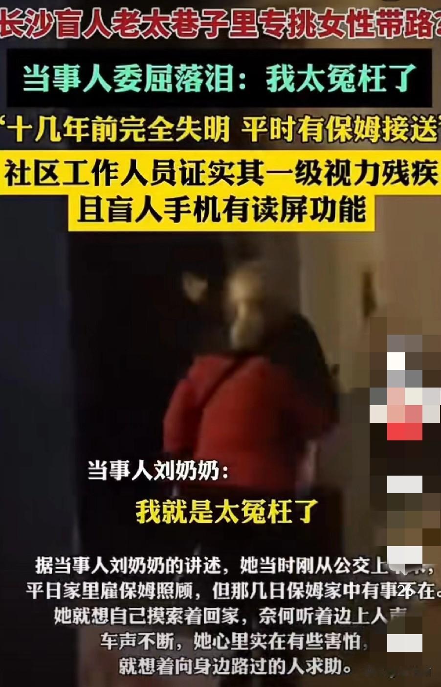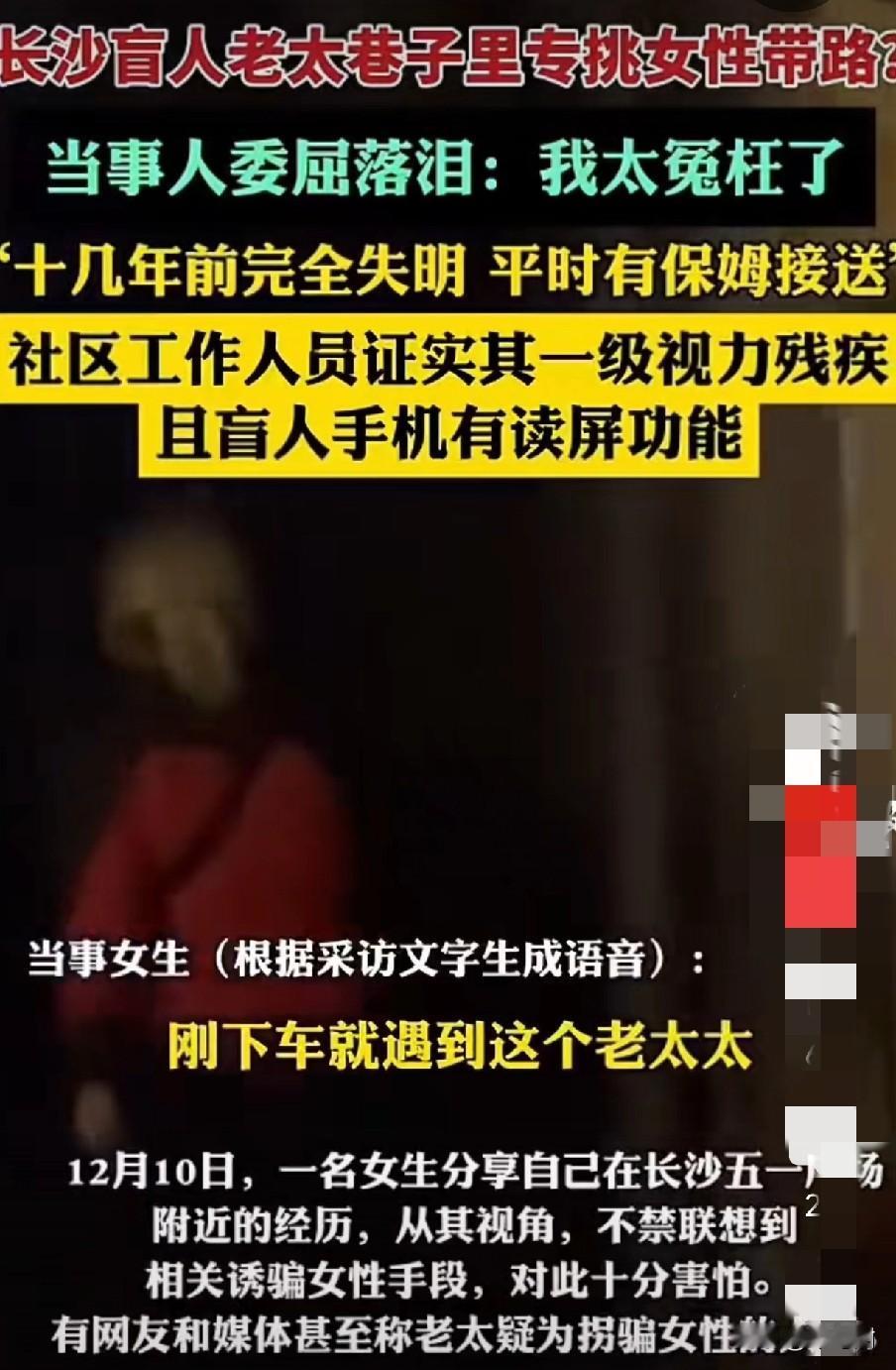 最近火了的“长沙盲人老太”专挑女性带路,后续来了。当事人委屈落泪,称自己太委屈了,社区证实老人确实是残疾人。 近日有一女子发视频,说自己好像遇到“假装盲人”的老人让其帮忙带路,看到老人可以扫描手机,就怀疑是诱骗。此事曝光后,有认识该老人的邻居告诉老人,你被“网曝了”。 此时老人才知道前因后果,顿感委屈,她是住在附近的退休教师公寓里,73岁,十几年前就失明了,那几日她的保姆有事没有照顾她,她想着尝试一个人摸索回家,听到旁边有女性的声音,才壮着胆子请求帮助,可没想到遭到拒绝还被“网曝”她心怀不轨。 对于盲人用手机一事,社区工作人员也替大家回应,老人手机装了读屏幕功能,根据点击就会有相应的朗读声。所以当时就被发视频的女生误会了。其实也不能全怪女生,换大晚上这个情景,多一点防备之心也并没有错。