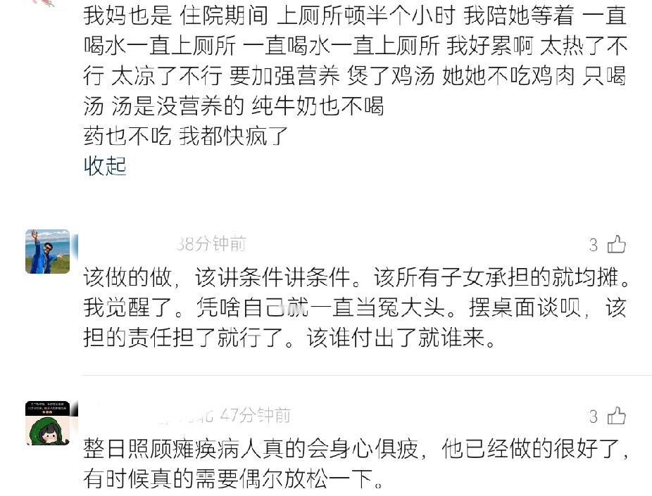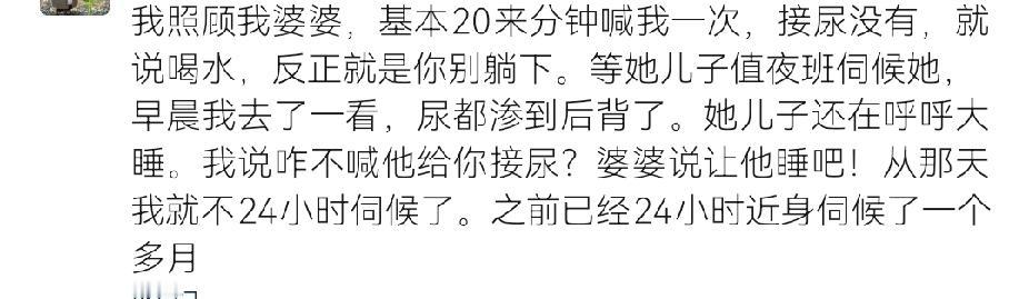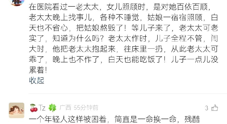 看完后我的心中五味杂陈!男子整日照顾瘫痪的母亲,抽空打篮球放松时无视一直在敲窗的母亲! 视频中,男子在院子里拿着一只篮球不断地模拟投篮、跳跃,看起来活力十足!老母亲瘫痪在床,阳光透过大大的窗户洒在老母亲的身上,看起来暖洋洋的。 老母亲看着窗外的儿子,不断地用手敲打窗户,不断地唤儿子。窗户不断发出的敲击声让儿子停顿了一下打球的动作,但他没有选择理会母亲,而是继续投篮、跳跃…… 或许有人会说:“母亲对孩子都是有求必应,乌鸦反哺羊羔跪乳,男子的做法也太不应该了!” 但有网友说:“久病床前无孝子,没有照顾过瘫痪老人的人,永远无法体会到那种无力感和窒息感。” 网友称,照顾老人和照顾孩子完全不是一个概念。孩子,不饿不冷不热,身上舒服就会高高兴兴。而老人,照顾的越细心,就会越矫情。 整日贴身伺候老人,不离不弃已经是最大的孝心。有网友分享:一个病房的老太太,病房的病友强烈要求让老太太的儿子陪床。因为老太太的女儿是个对母亲百依百顺的人,老太太就整夜整夜地折腾不让她女儿睡觉,弄得整个病房的人都睡不着觉。而老太太的儿子陪床,老太太就老实了,一觉睡到大天亮! 还有网友分享:大姑瘫痪在床,各种找事不让儿女合眼。三个表姐只能轮流照顾轮流睡觉。感觉大姑再不走,三个表姐都快被熬走了! 还有一位网友的分享更加扎心!女子照顾婆婆,婆婆20分钟就喊一次,不是尿尿,就是喝水。要么就是这里不舒服要挠一下,那里不舒服要翻个身,24小时陪护的那种。后来某一天自己有事老公陪护。女子第二天一早赶到医院时,发现婆婆的尿都渗到后背了,而丈夫还在一旁呼呼大睡。女子想叫醒丈夫时,婆婆却说:“让他睡吧!”从那以后,女子似乎明白了什么,再也不对婆婆24小时贴身陪护。会给自己安排时间出去透透气放松放松。 所以说真的不是子女没有耐心,而是但凡是人都需要有自己的空间,都需要休息和放松。而有的时候子女明明已经尽心尽力,老人还是不放过! 并不是说我们要忽略老人的需求,而是凡事都要适度。而有的老人在折腾儿女的时候并不懂适可而止。 如果你做到了没有责骂老人,给老人按时喂药擦屎擦尿,保证父老人不渴不饿不冷不热。作为孩子的你也要懂得照顾自己。先有一个健康的身体,再做孝子!久病床前无孝子 照顾瘫痪老人辛酸都有哪些
