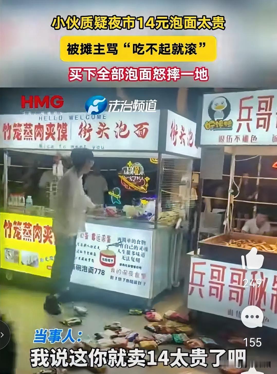 小伙只是说了一句贵,商家就轻蔑的骂其“吃不起就滚”。某地一夜市,一名小伙走到泡面摊位前询问价格,当听到14元一份后,小伙表示有点贵,商家随口骂了句“吃不起就滚”,此话一出顿时激起小伙心中怒火,当众买下所有泡面后一阵乱扔。 商家面对顾客对产品价格有质疑的时候,可以耐心向其解释原因,切不可带有这种诋毁口气轻蔑顾客,否则你的生意只有关门大吉。