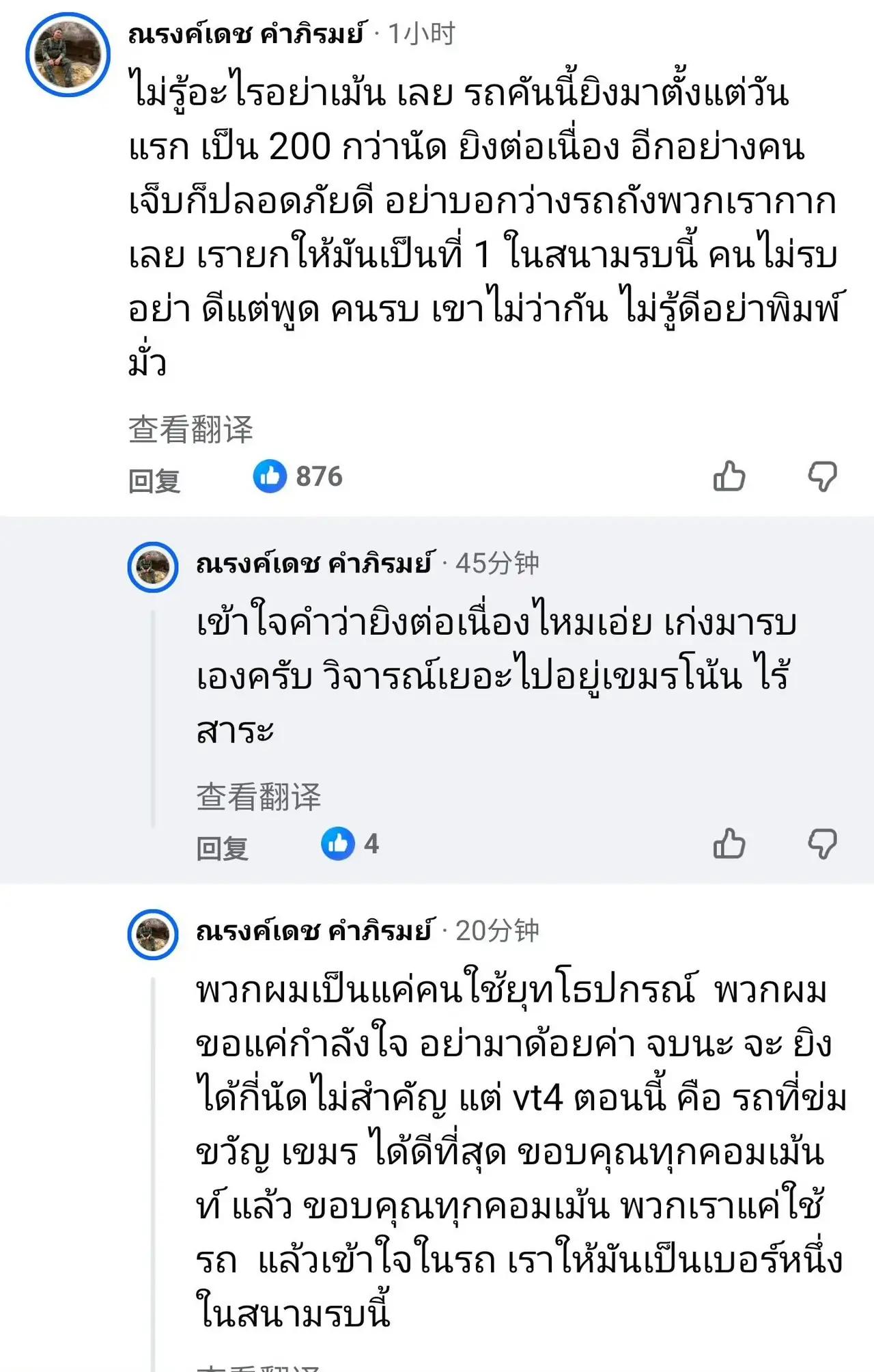 中国出口泰国的VT-4坦克在战斗中居然炸膛了。这让美西方媒体、印度媒体开心得不得了,但奇怪的是泰国士兵也很开心。 那些媒体开心我们可以理解,毕竟中国军火上半年才在印巴空战中大显神威,要是这次又大出风头,他们还不得没法活啊。 所以,一看到坦克炸膛,那简直像捡到宝了。 然而,泰国士兵居然也很开心。 为啥呢? 因为就算炸膛了,他们都还能活下来。 因为他们都连续打了200多发炮弹了。 生产队的驴都不敢这么用啊! 再比较一下其他坦克的连续射击水平,泰国士兵才是真的捡到宝。难怪不得他们在炸膛后还能开开心心拿出手机玩自拍。 这个问题根本不用去讨论,看看以后泰国还买不买中国坦克就知道了。 点右上角关注我,我们一起去看这个魔幻的世界