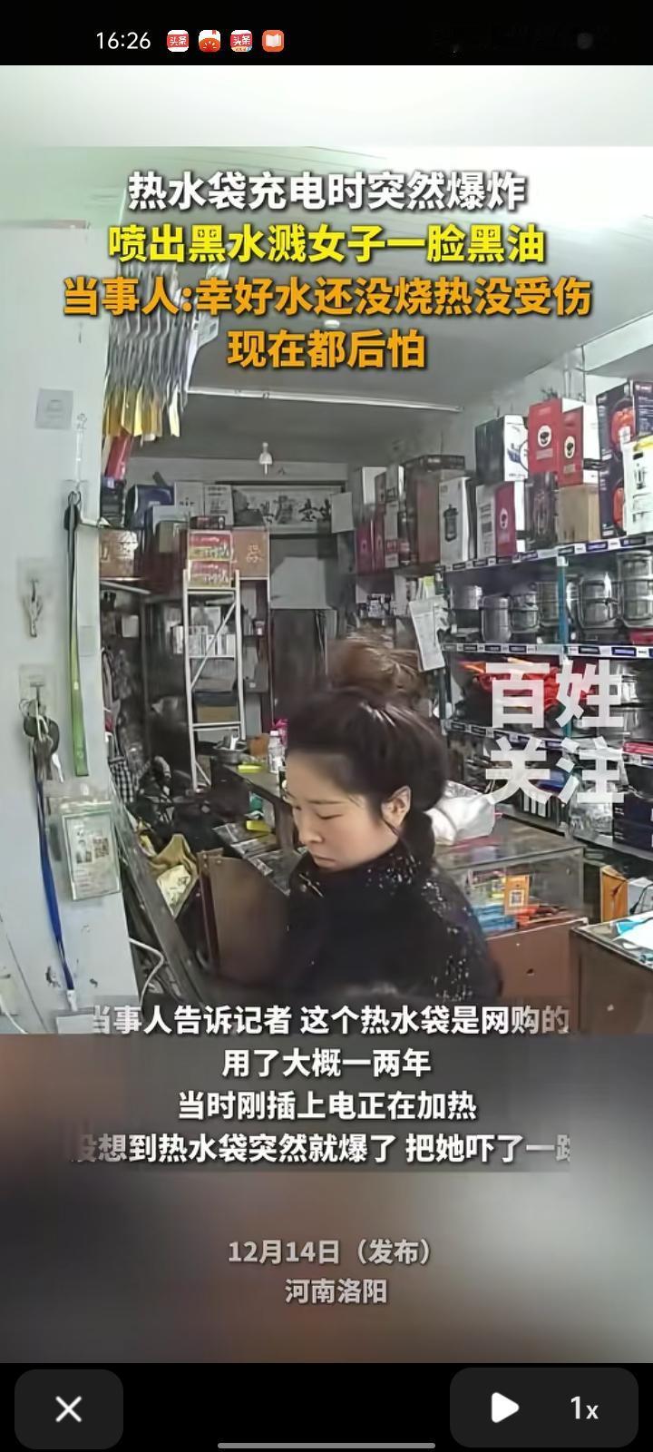 12月12日,洛阳市汝阳县。女子用热水袋充电时突然爆炸,喷出黑水溅了她一油。当事人介绍,这个热水袋是网购的,用了大概一两年,没想到热水袋突然爆了,把她吓一跳。幸亏水没烧热,否则有可能受伤,爆炸那一声巨响把她妈妈的耳朵震得嗡嗡响了半天。