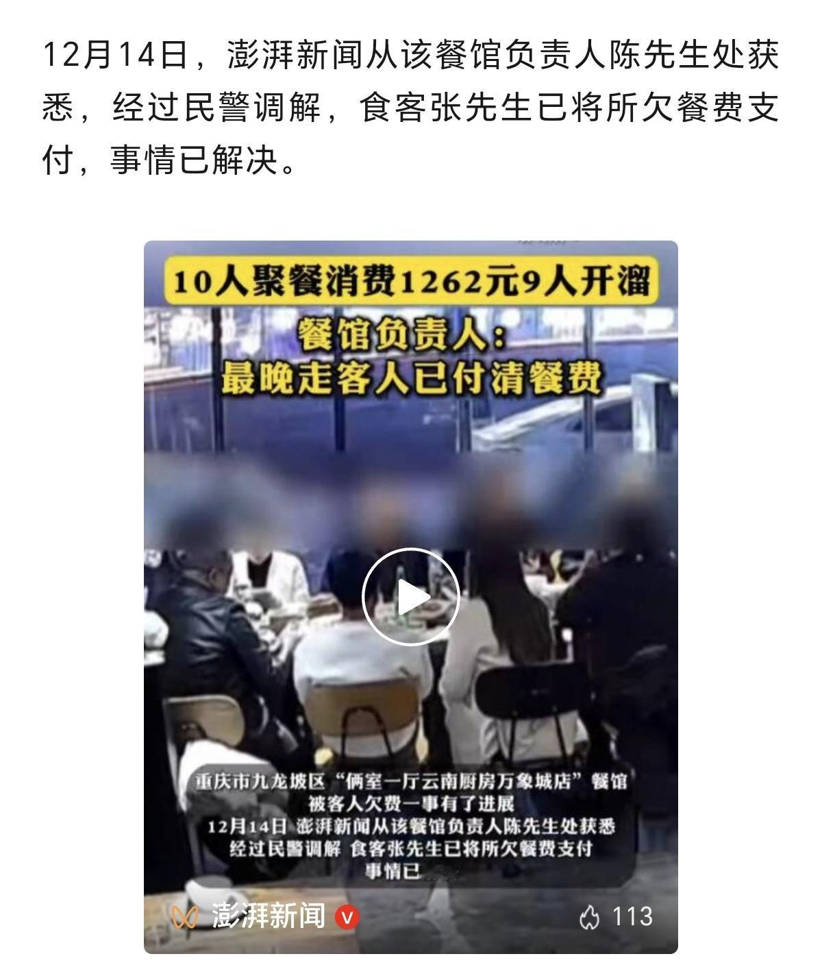 10人聚餐消费1262元,9人“开溜”后续来了。据报道,12月14日,餐馆陈先生告诉媒体,经过民警的再次调节,张先生已经把全部餐费支付了。事情已经得到了解决。 怎么说呢,像这种朋友之间的聚餐,最好是能够在聚餐前,说清楚,餐费怎么支付。是由组局者自己一个人付,还是大家AA制。在前往聚餐之前,最好是了解清楚。这样也能尽可能的避免,结账买单时,相互推诿。
