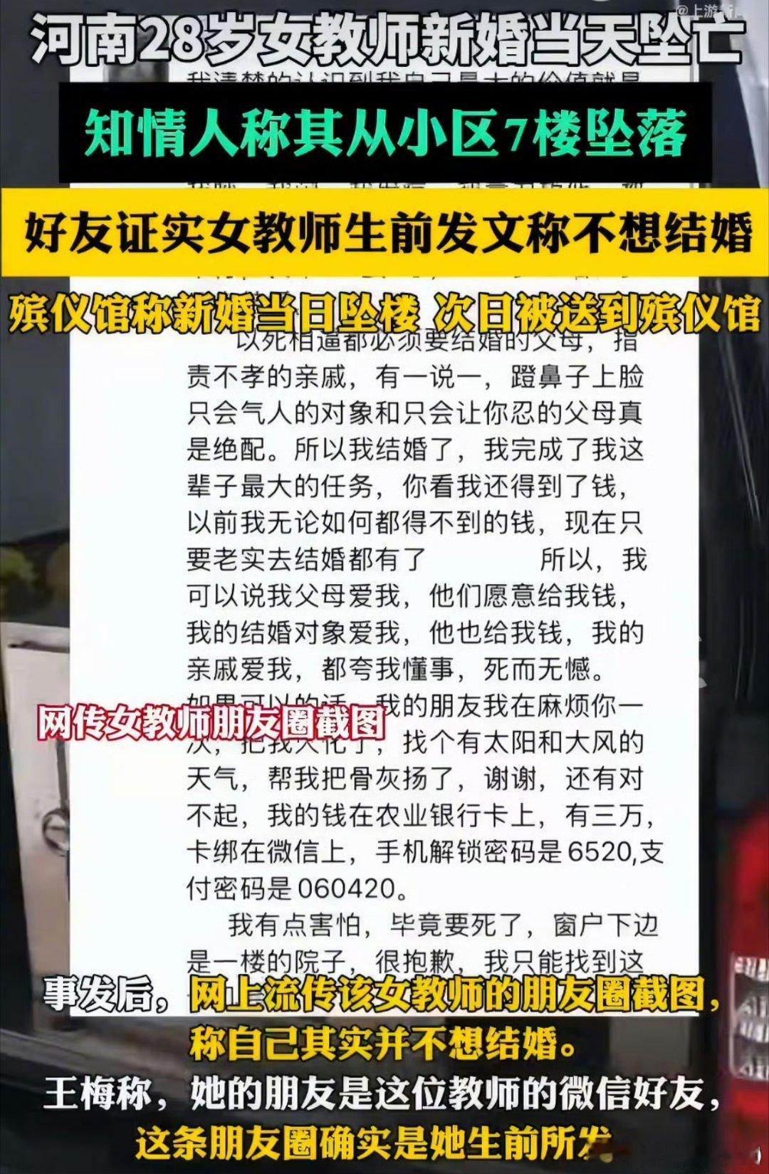 高中女教师新婚当天坠楼身亡11年啊,反抗11年,上大学就开始了反抗还有朋友遇到类似情况,干脆直接逃离好了,消失了也好