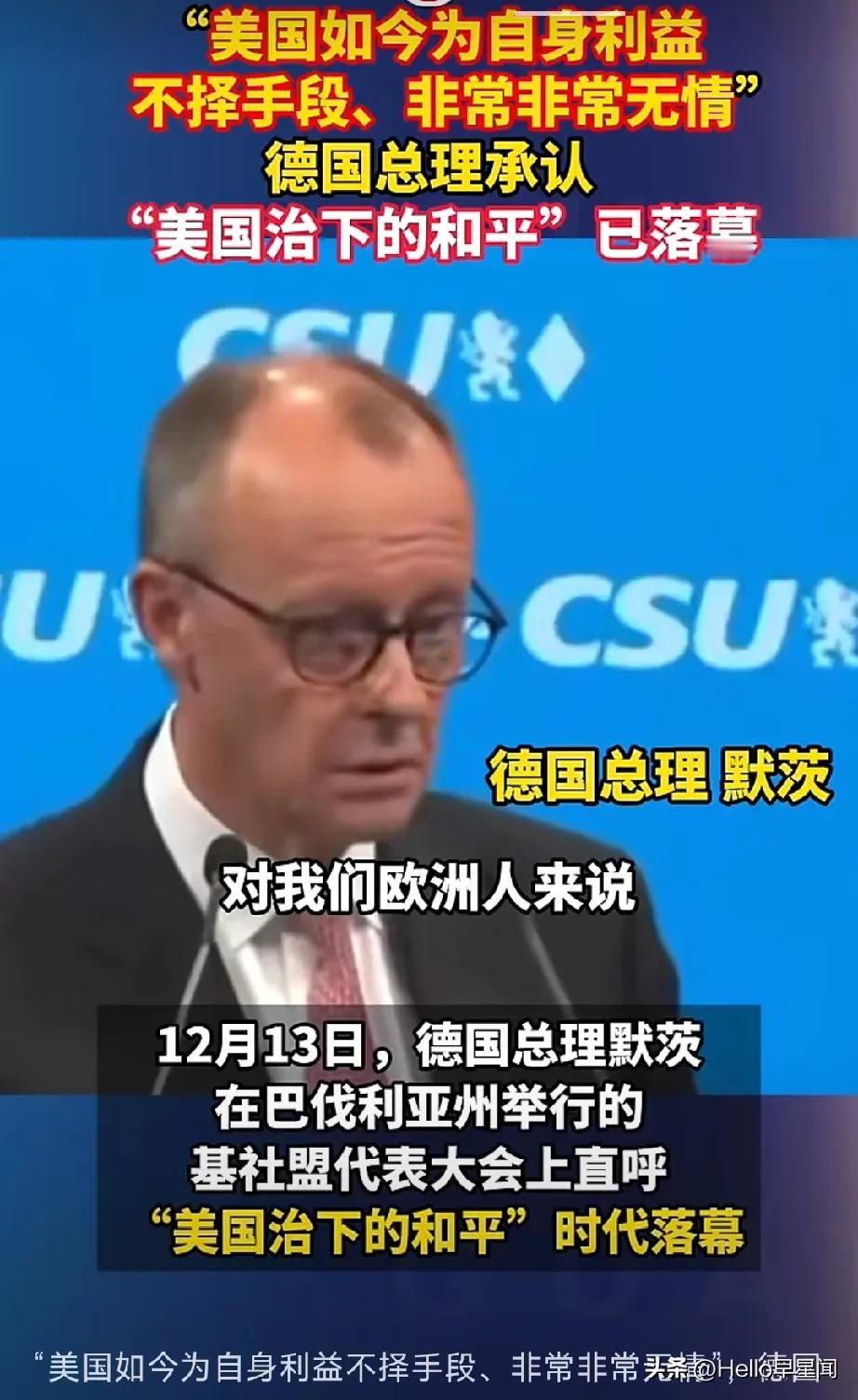 彻底绝望了! 欧洲首次给美国定义了两个“非常”…… 12月13日,德国总理默茨在俄乌和平计划问题上,表态: 美国为了自己的利益“不择手段,非常非常无情!” 其实默茨这种绝望表态来自两方面: -欧洲失去了安全感——美国2027年放弃欧洲防务; -欧美大势已去——美国退回西半球。 一场俄乌战争不仅打退了欧洲,同时也打醒了欧洲,欧洲人在欧美同床异梦中终于看清了真正现实!