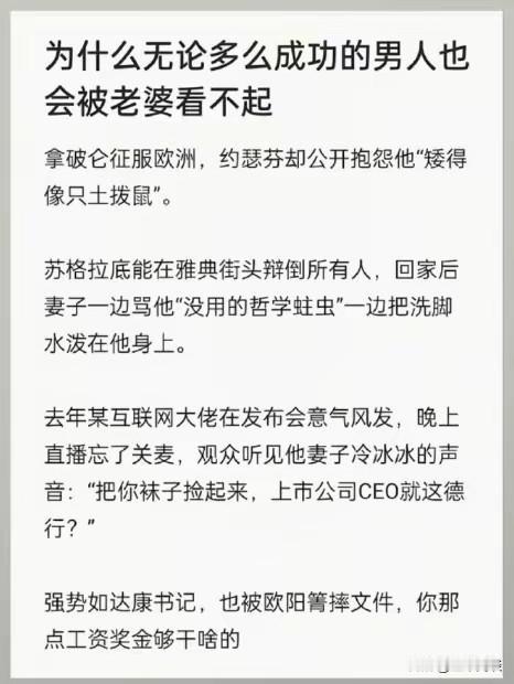 仆人眼中无伟人,其实老婆也差不多。在女人眼中,自己的老公再优秀,也就那么一回事,屎尿屁一样也不会少。不过,抛开人的动物性不谈,从格局和境界的角度来看,人的情商和智商还是有不小差距的,毕竟乌鸦群里还是有天鹅存在的。问题是,大多数女人可不这么想,在她们看来,任何男人的缺点都是不可容忍的,仿佛世上只有自己最完美,无论嫁给谁,都亏了,都是插在了牛粪上,都是被猪拱了。拿破仑的老婆是这样,苏格拉底的老婆也是这样,至于在现代社会里,此类事儿更是层出不穷,不胜枚举。君不见,男人的世界里从来就不缺绿油油的大草原?
