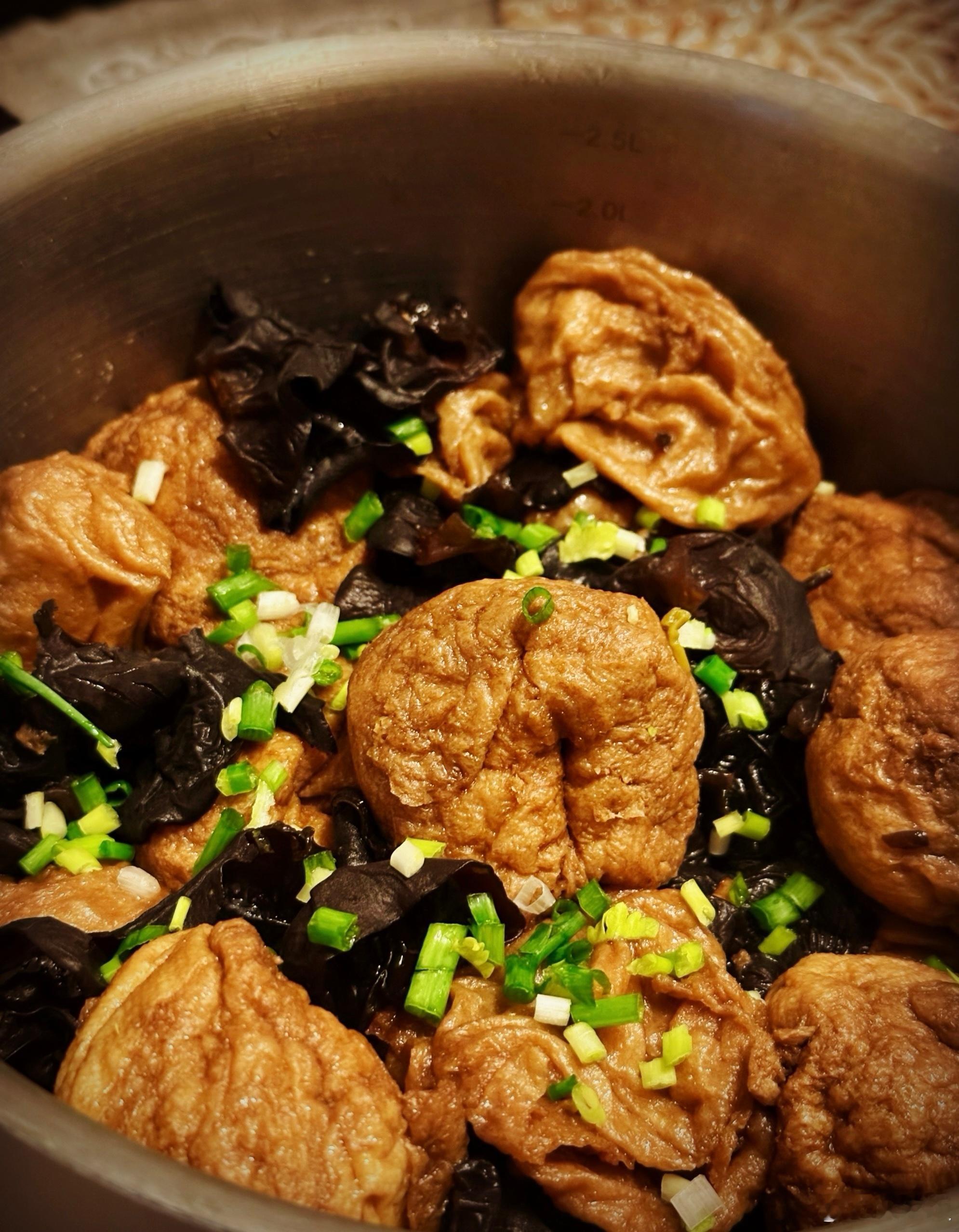 半间灶披间菜单这汤还是zhuyi 教我的,生姜一大块,花椒几颗,很淡的肉汤或者鸡汤,或者像我今天直接用昆布盐,柚子盐,白水,煮芥菜头,酥了就撒一把芹菜碎。清香回甘。开了暖气的房间里比较干,喝一碗这个汤润喉又温暖。乃么可以大口吃肉了,八只大油豆腐塞肉,十五只油面筋塞肉,一大碗黑木耳,吃下去半锅。细巧小菜也要有,两斤不到点石斑鱼开片,烧荠菜冬笋。开饭了。🍶