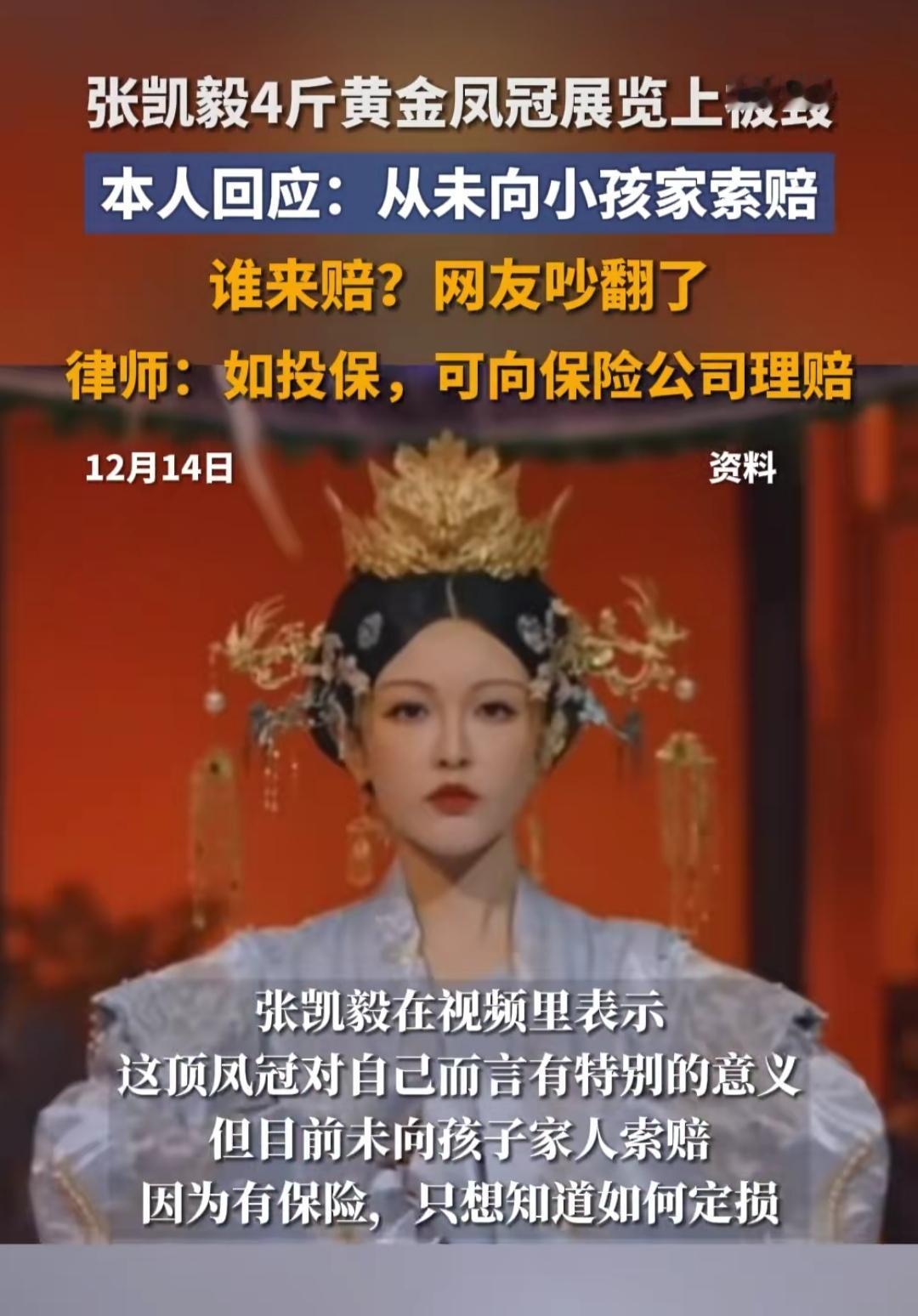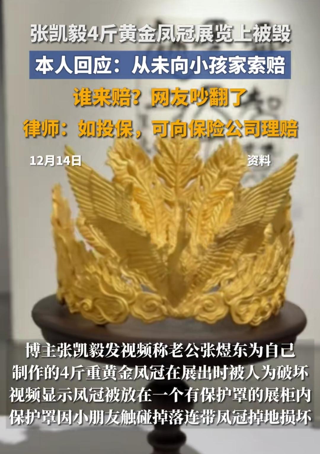 谁能想到,耗费心血打造的4斤黄金凤冠,竟在展览上被孩子一把推倒?碎片散落的瞬间,不仅是珠宝的损坏,更是创作者多年心血的崩塌。 这是张凯毅的珍藏,从设计到制作耗尽心思,每一片金饰都藏着对传统工艺的敬畏。事件曝光后,网友都等着看她向孩子家长索赔,毕竟这价值不菲的凤冠,修复起来也是笔不小的开支。 可她的回应却出乎所有人意料:“不怪孩子,也不索赔。” 没有指责,没有抱怨,只有一份难得的体谅。其实换谁遇到这种事都会心疼,但张凯毅明白,孩子并非故意,家长此刻也定然满心愧疚。 比起纠结赔偿多少,这份为人着想的格局更显珍贵。生活中,我们总难免遇到意外的伤害,可比起针锋相对的计较,一份宽容与体面,往往能化解更多矛盾。毕竟,有些温暖,远比金钱更有重量。