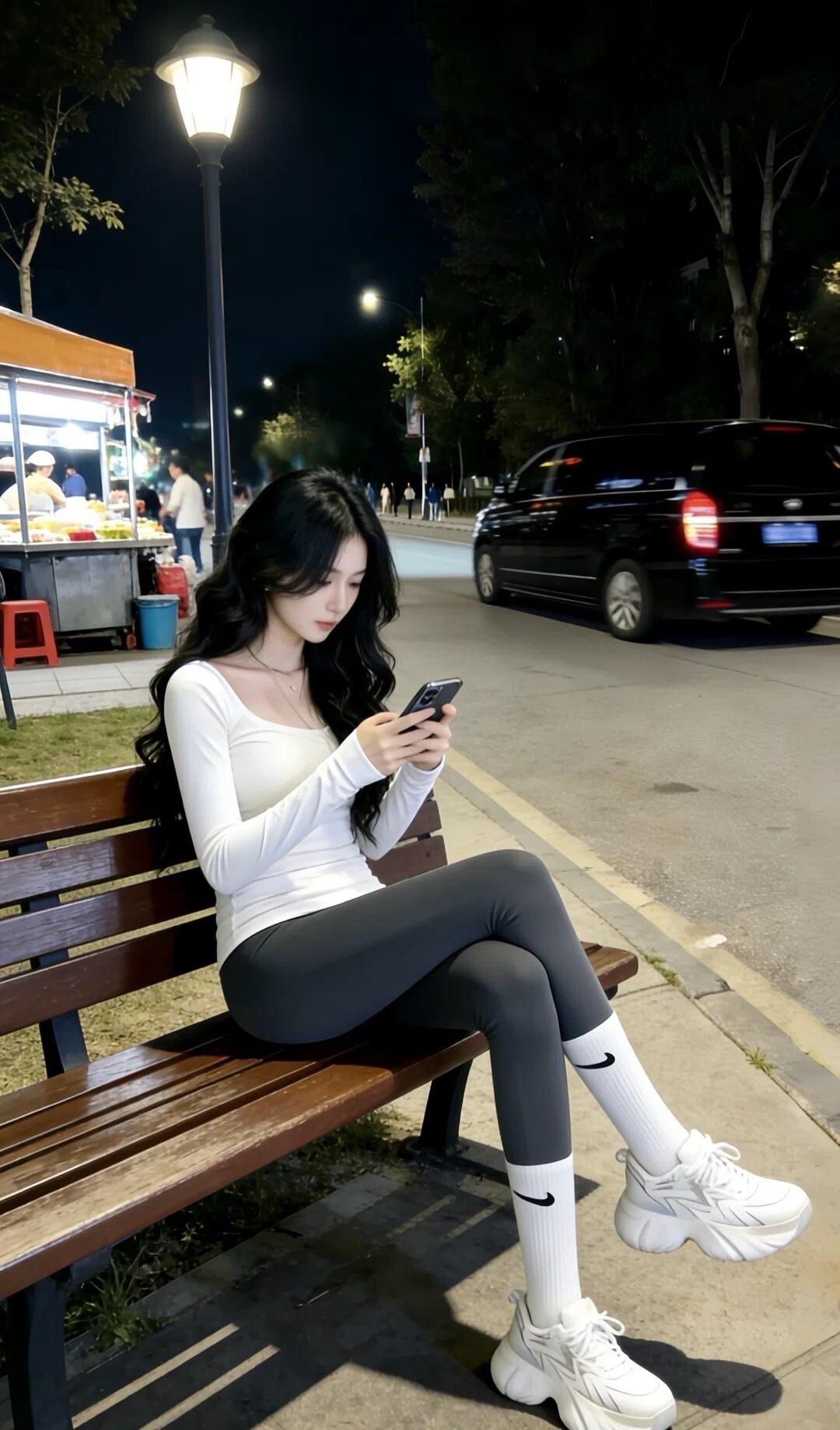 夜晚街头的少女,手机轻触,心事如风