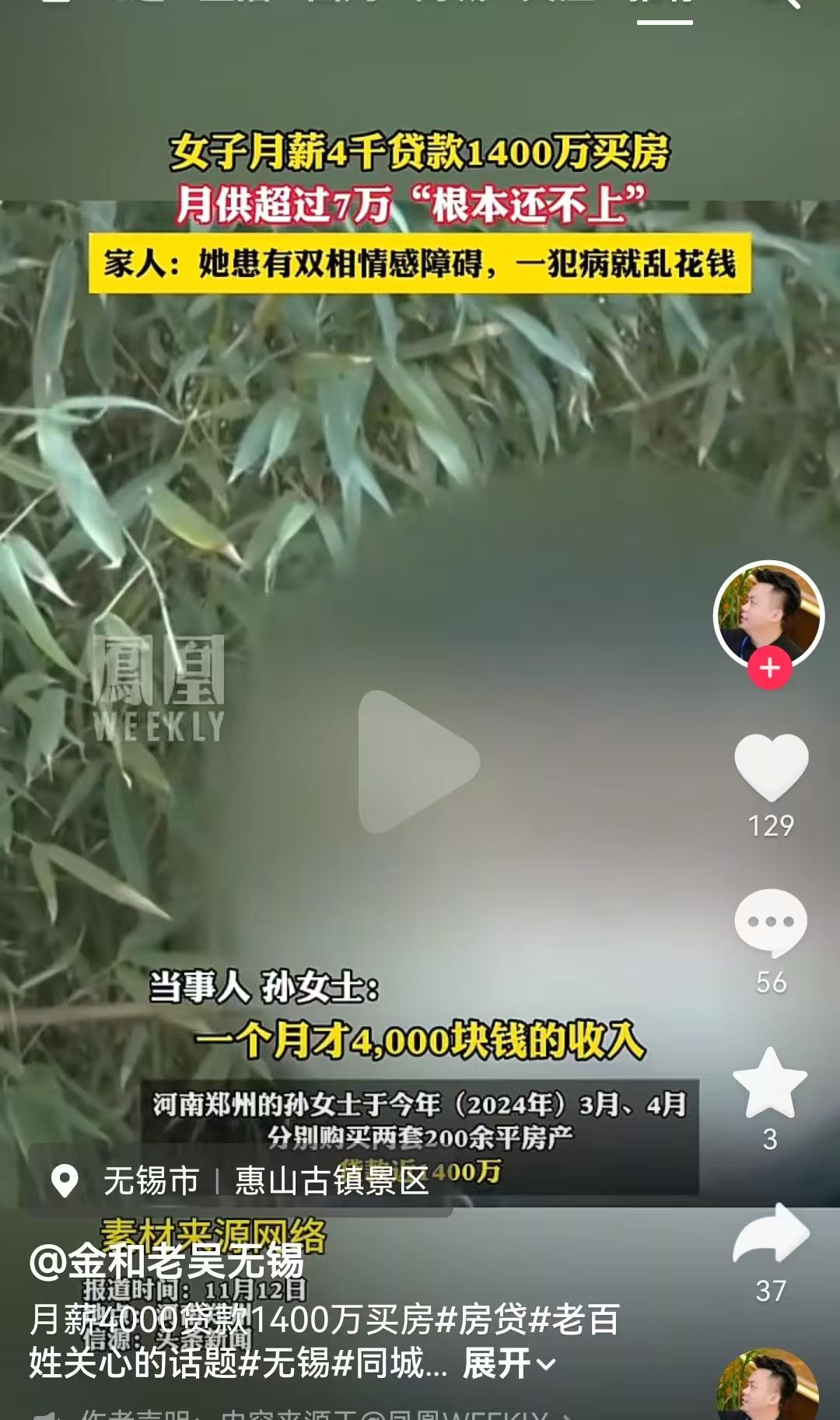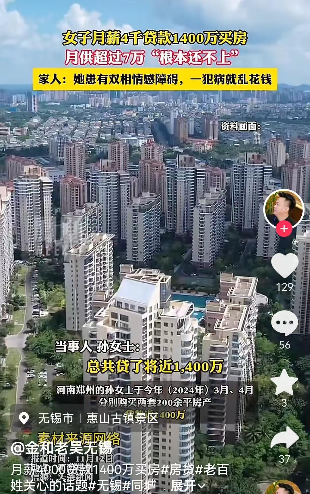 短剧都不敢这么写,一个月4000买块工资的人,竟然敢贷款1400万,买两套房! 这位来自河南郑州的孙女士,真是一位猛人! 据媒体报道,孙女士在2024年3月与4月间,分别购买了两套200余平米的房产,总共贷款1400万元,每个月要还7万多,而孙女的月薪只有4000元。 孙女士买房理由是,花完钱后她很舒服很开心。 然而不出意外,意外就来了,还了几个月后,孙女士就发现,根本就还不过来。 据孙女士的母亲介绍,孙女士有双相情感障碍,这种病发作的表现,就是花钱花的吓人,根本控制不住,孙母坦言,自己从来没有见过这天文数字。 孙女士买房子的时候,根本就没有想过那么多,她对记者说,她只是花完钱后感觉很舒服,很开心,从来没有考虑那么多。 小编很疑惑:月薪4000,怎么能贷出1400万来? 一般普通人,根本没有这个能力,能贷出这么多钱来? 难道是孙女士笃定房价一定会涨,所以不管不顾,先贷出来再说?反正房价上涨,实在还不动,房子一卖万事大吉。 当然,也有人支持孙女士,认为人活着开心最重要,孙女士觉得花钱开心就行。 反正,现在是不可能还上了,也不知道这事最后会怎么处理。 对此,大家怎么看,欢迎留言评论,谢谢大家。