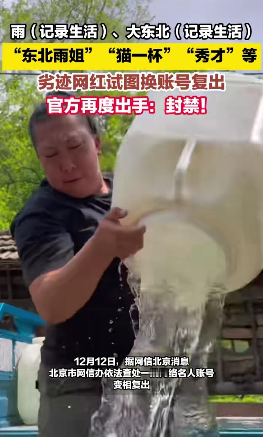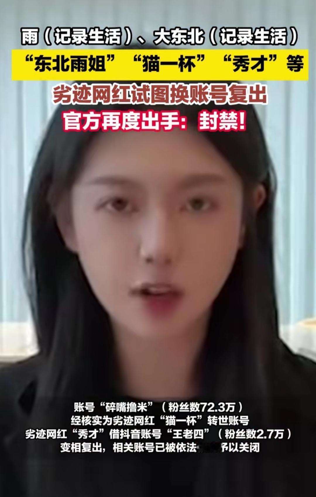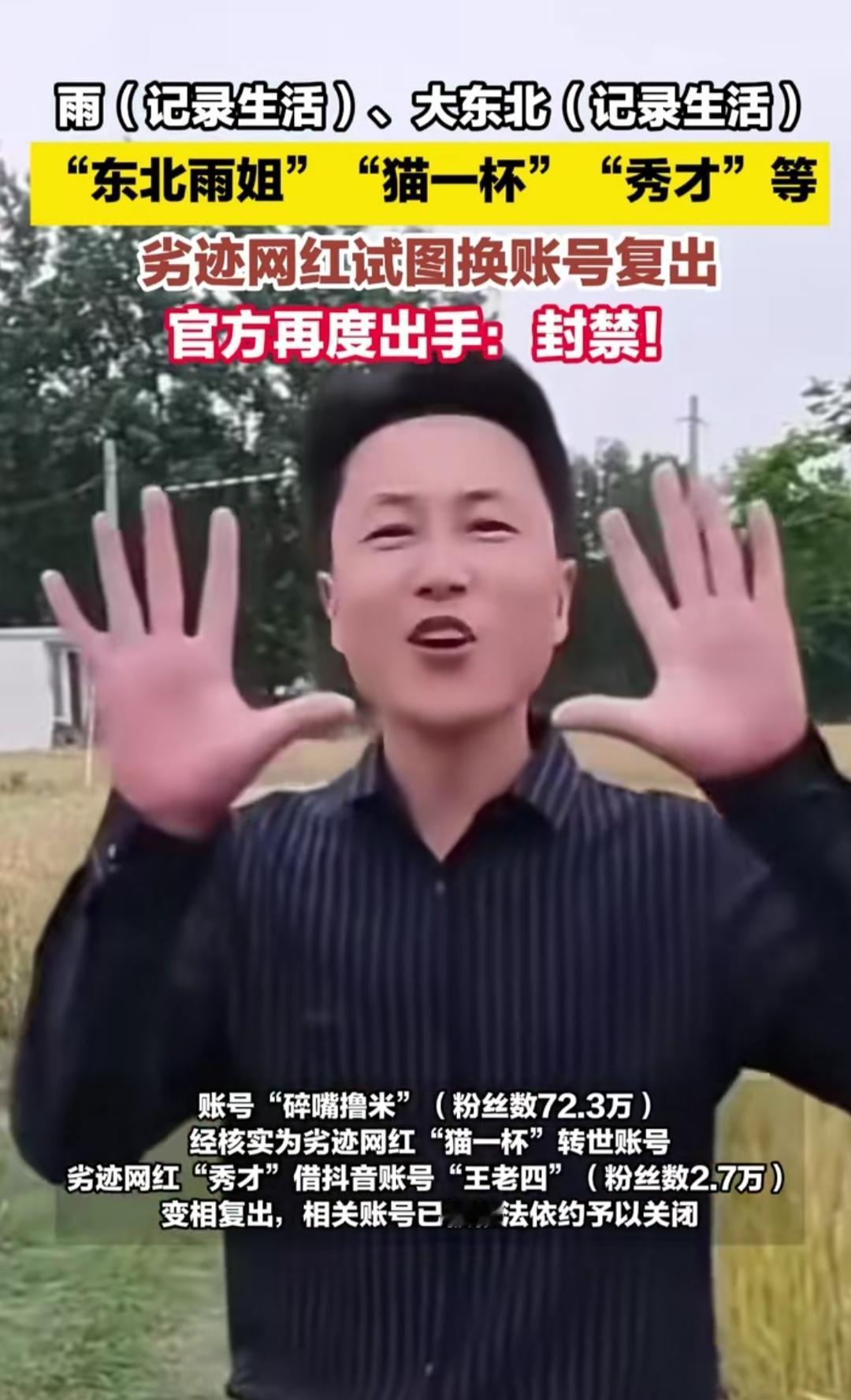 刷到网信北京的通报,东北雨姐、猫一杯这些劣迹网红换“马甲号”偷偷复出,结果全被官方直接封禁,真的大快人心!本以为他们被封后会反思悔改,没想到竟玩起换号的小聪明。 这些网红当初各有劣迹,要么造假营销博眼球,要么触碰公序良俗的底线,被封时还假意道歉表决心。转头就火速注册新号,猫一杯弄了“碎嘴撸米”,秀才用了“王老四”,企图换层皮继续收割粉丝流量。 可网络从不是法外之地,观众也不会为劣迹买单。平台这次的重拳整治,不仅断了他们的复出路,更守住了网络空间的底线。流量从来不是遮羞布,只有守规矩、传正能量,才能真正站稳脚跟。你支持对劣迹网红零容忍吗?