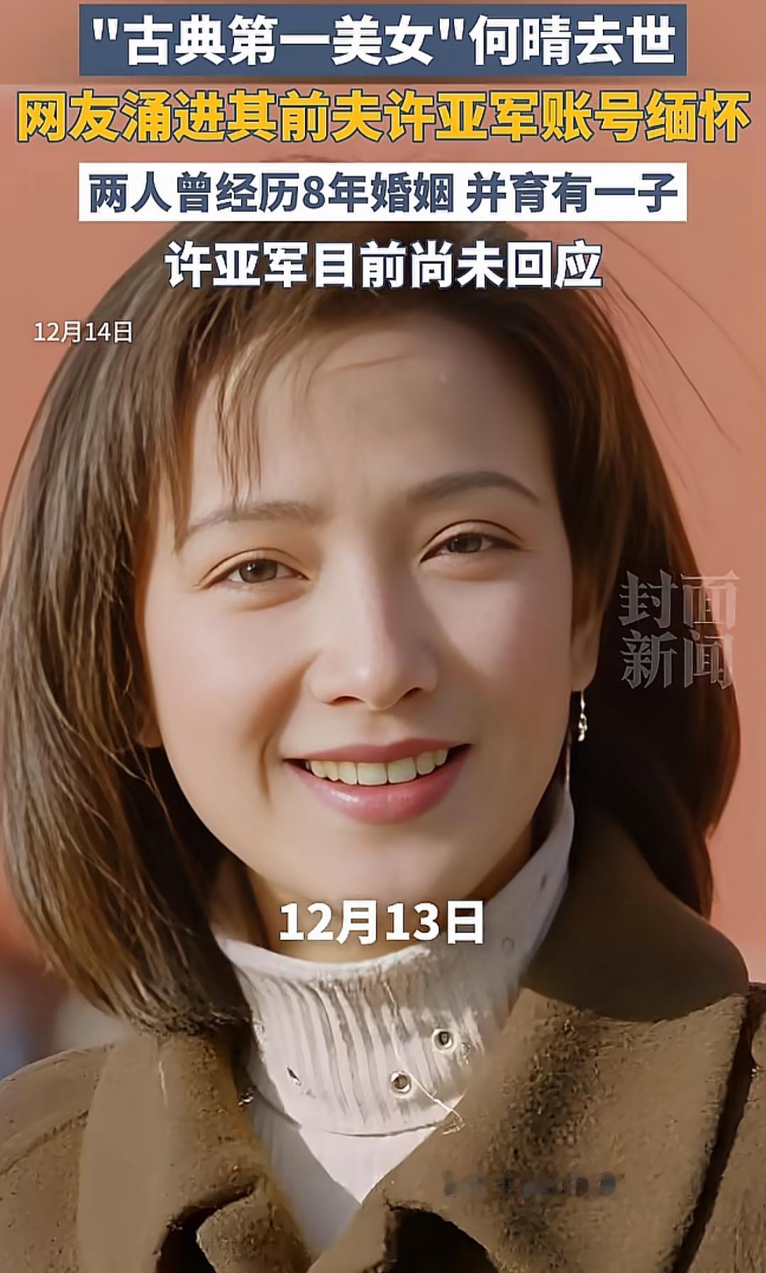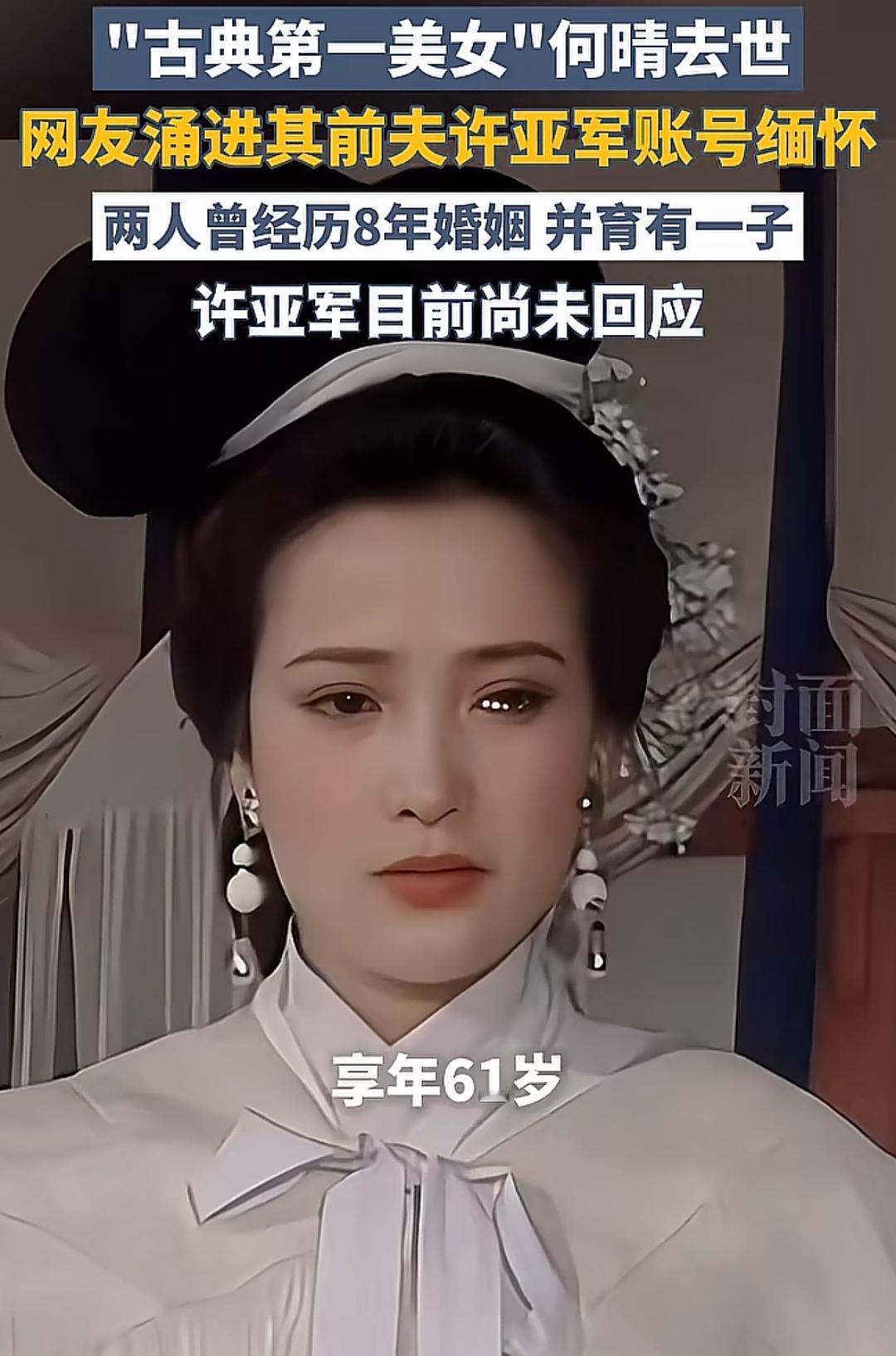 61岁去世,不老不少,让很多40岁、50岁的人集体缅怀,集体感叹生命无偿。 她很漂亮,辉煌过,经历了轰轰烈烈的人生,事业有成,婚姻幸福与否无法判断,这样的人生,除了寿命稍微短点,也没什么大的遗憾了吧。