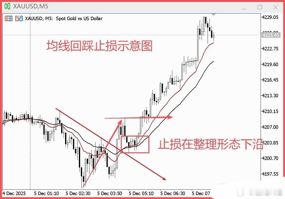 均线踩稳后,止损这么设最省事均线踩稳了,止损不用想复杂,直接放“踩稳那波结构的回踩低点”就行。就两个原因:1. 这是买盘真正进场的位置,跌破就说明结构坏了;2. 止损距离近,风险小,盈亏比自然更划算。看黄金走势的例子:价格破了下降趋势线、站上均线且均线金叉后,会有一次干净的回踩,还能稳在均线附近。这时候进场,把止损放这次回踩的低点,就很合理。不用猜也不用复杂判断,记住:均线踩稳→进场→止损放回踩低点,结构明明白白,风险也能控制住。