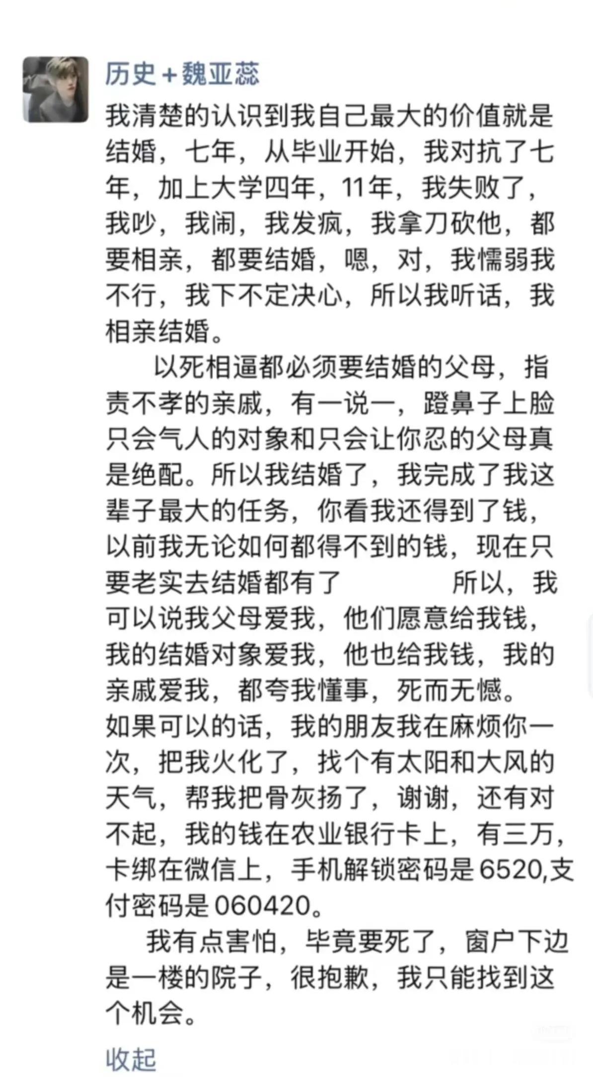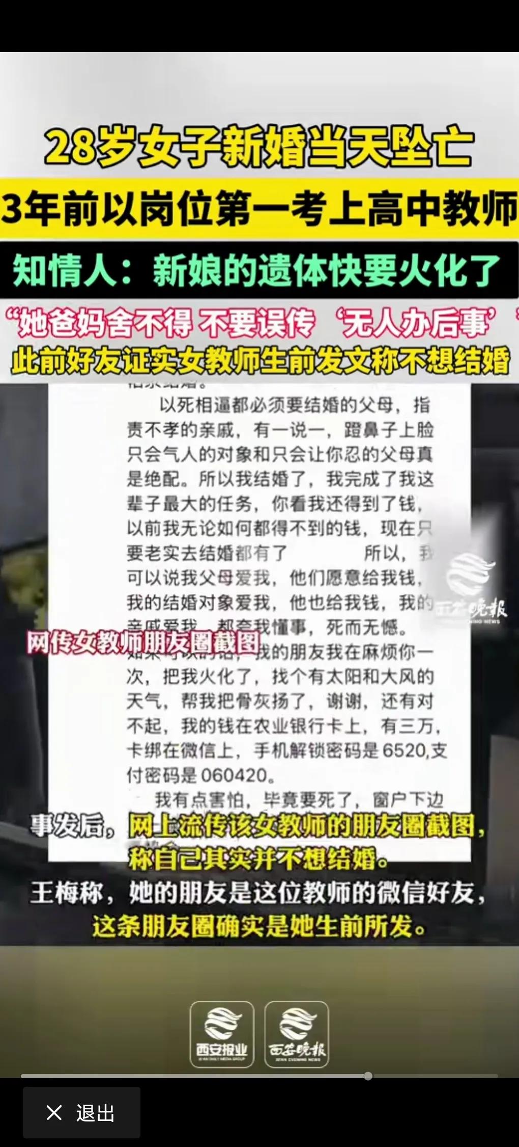 一个高学历的女教师,结婚当天坠亡,原因是父母催婚,以S相逼着她结婚,她身边的人都认为不结婚是不孝。 她抗拒不了,只能听话,却选择新婚当天自S。 从这件事发生后,得警醒多少人, 孩子不想结婚,就不要逼迫,健健康康的活着比什么都强。