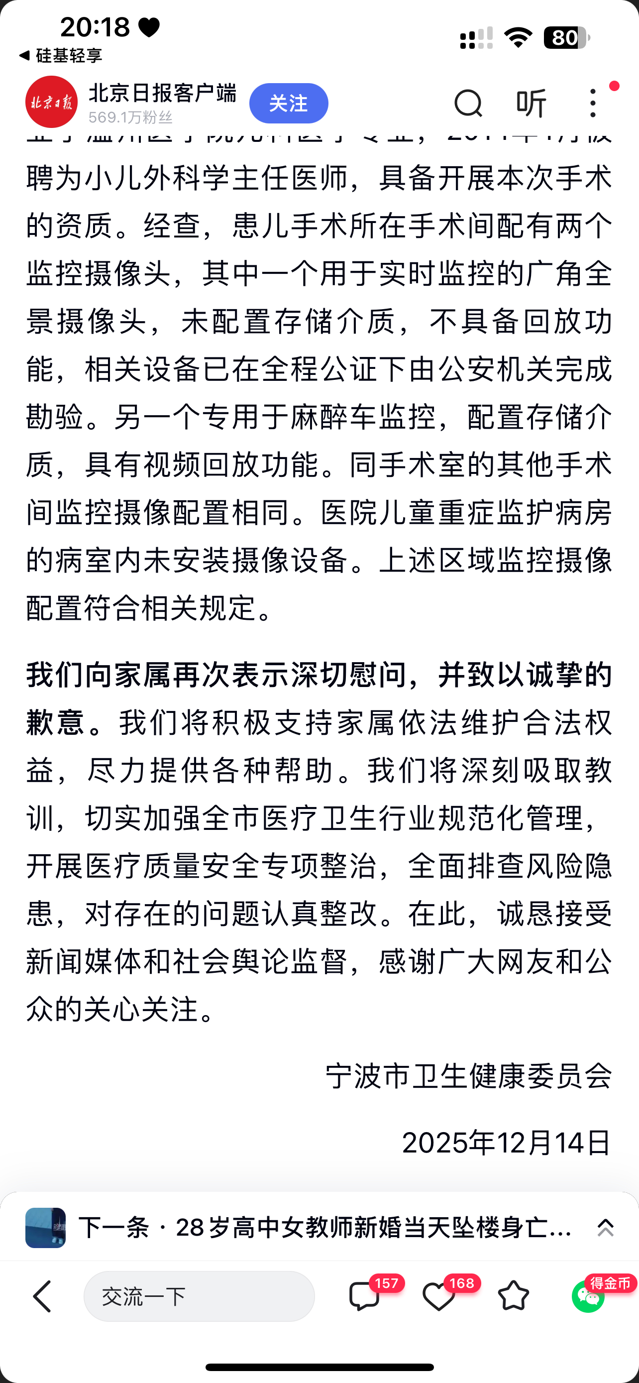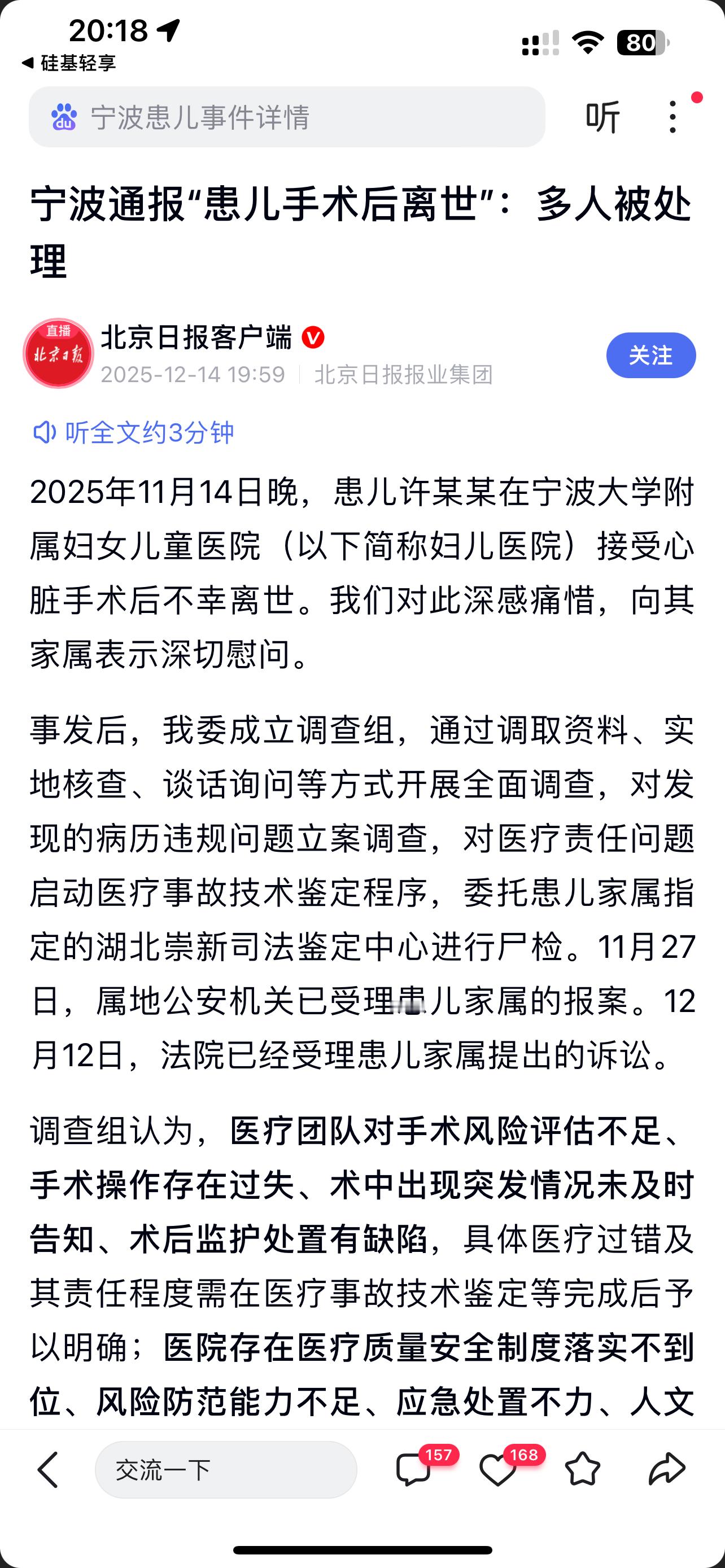 宁波通报“患儿手术后离世”:多人被处理宁波通报患儿手术后离世
