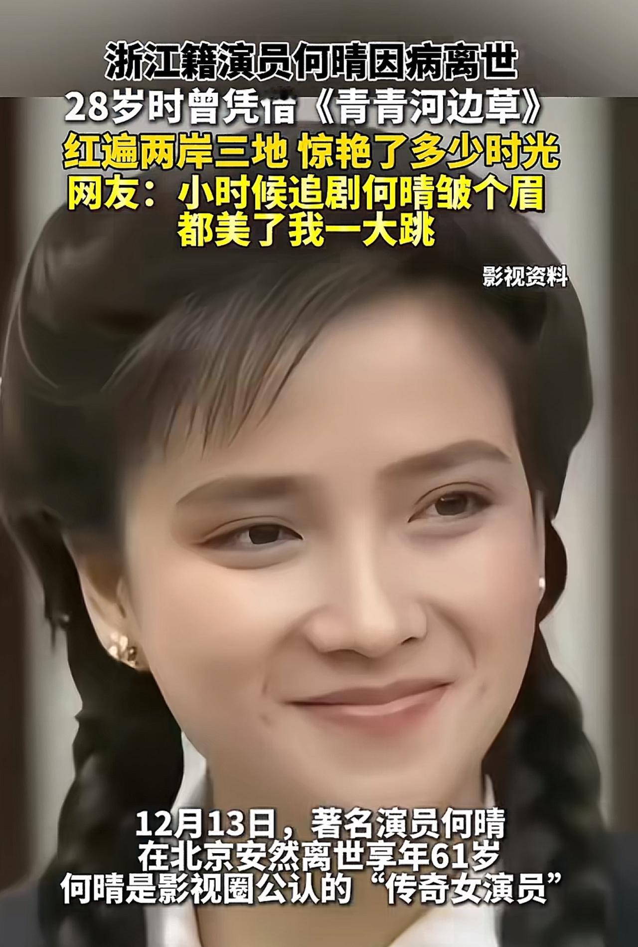 真是很遗憾[叹气]!有着"内地古典美人"之称的女星何晴,近日因病在北京离世,享年61岁。她塑造过不少经典人物,四大名著她全都有出演。 有很多人不知道,早些年她患了脑瘤,后来又中风。这些年一直在疗养中,也就没继续演戏了[皱眉]。 现在她虽然离开了大家,但她出演的那些作品,会继续陪伴着观众。你看过她的剧吗?哪个角色让你印象深?来评论区讨论下吧[灵光一闪]。(图片素材来自杭州网)