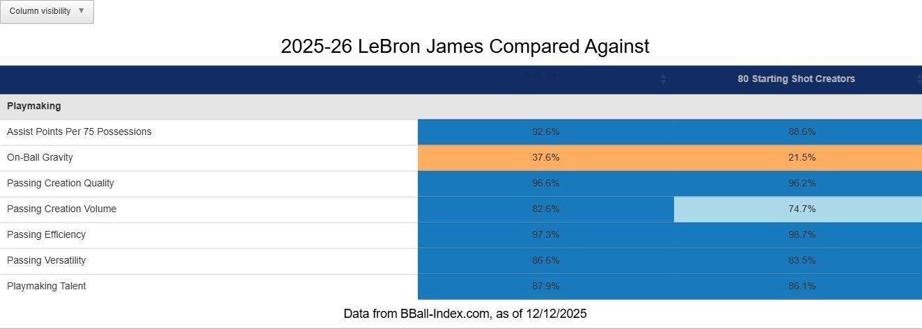 勒布朗-詹姆斯2025-26赛季组织能力:1. 每75回合助攻得分:对比150名首发球员占比前92.6%,对比80名首发持球进攻手占比前86.6%2. 持球吸引力:对比150名首发球员占比前37.6%,对比80名首发持球进攻手占比前21.5%3. 传球创造质量:对比150名首发球员占比前96.6%,对比80名首发持球进攻手占比前96.2%4. 传球创造量:对比150名首发球员占比前82.6%,对比80名首发持球进攻手占比前74.7%5. 传球效率:对比150名首发球员占比前97.3%,对比80名首发持球进攻手占比前98.7%6. 传球多样性:对比150名首发球员占比前86.6%,对比80名首发持球进攻手占比前85.5%7. 组织天赋:对比150名首发球员占比前87.9%,对比80名首发持球进攻手占比前86.1%