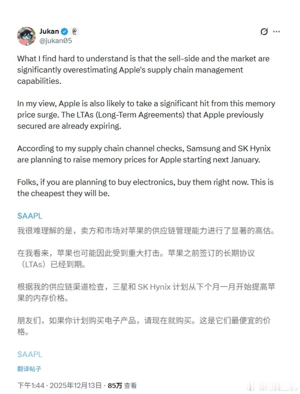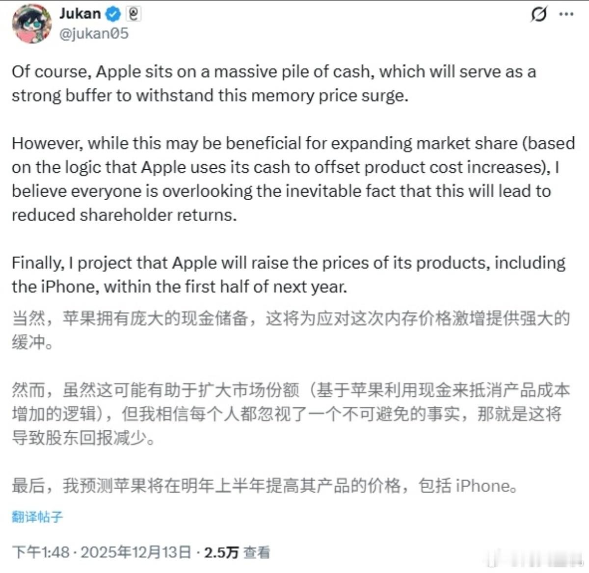 内存闪存这波涨价潮,苹果也逃不掉,明年1月份三星海力士这些厂商,即使面对苹果也要涨价,这相当于也给苹果涨价找了个借口。国产厂商是铁定会涨价了,毕竟他们都是贴着成本在卖,硬件成本涨价了,他们也得跟着涨。苹果可不一样,按苹果现在内存的选装价格来说,供应商涨价无非就是影响他的利润率,就他看要不要维持利润率涨价了。当初关税战,苹果连夜把iPhone装满整个飞机从印度运回美国,可以看得出苹果是不愿意让iPhone突然涨价。苹果这金子定价确实能cover住内存涨价,就算按现在的定价苹果也不会亏,就看苹果做不做大善人了。数码科技评论
