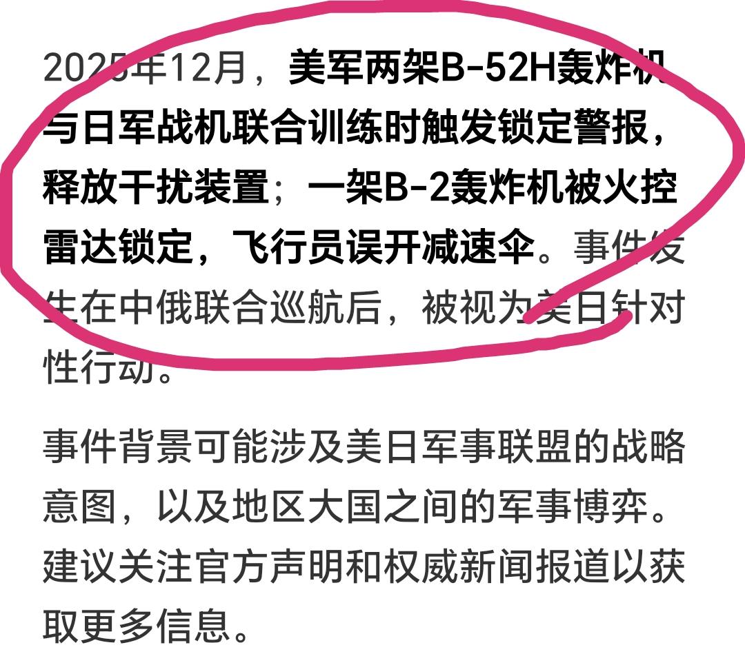 美军这次丢人丢大了[笑哭][笑哭][笑哭][笑哭]。中俄轰炸机编队联合巡航日本,美军被日本人请来撑场子,结果美军B52H被我们用火控雷达锁了。然后慌不择路跑了,跑的时候按错键把减速降落伞弹出来了。[捂脸] 美军飞行员可能从来都没有遇到这种情况,居然敢有人用火控雷达锁他,心里一慌,手忙脚乱,幸好还只是把降落伞弹出来了,要是按错了其他按钮,飞机坠毁了就更丢脸了。 事后发现只是我们在做模拟考试。[偷笑][偷笑][偷笑] 下次还是环岛旅行一次吧,这次美军有感,小日子没感,一定要满足他。 点右上角关注我,我们一起去看这个魔幻的世界